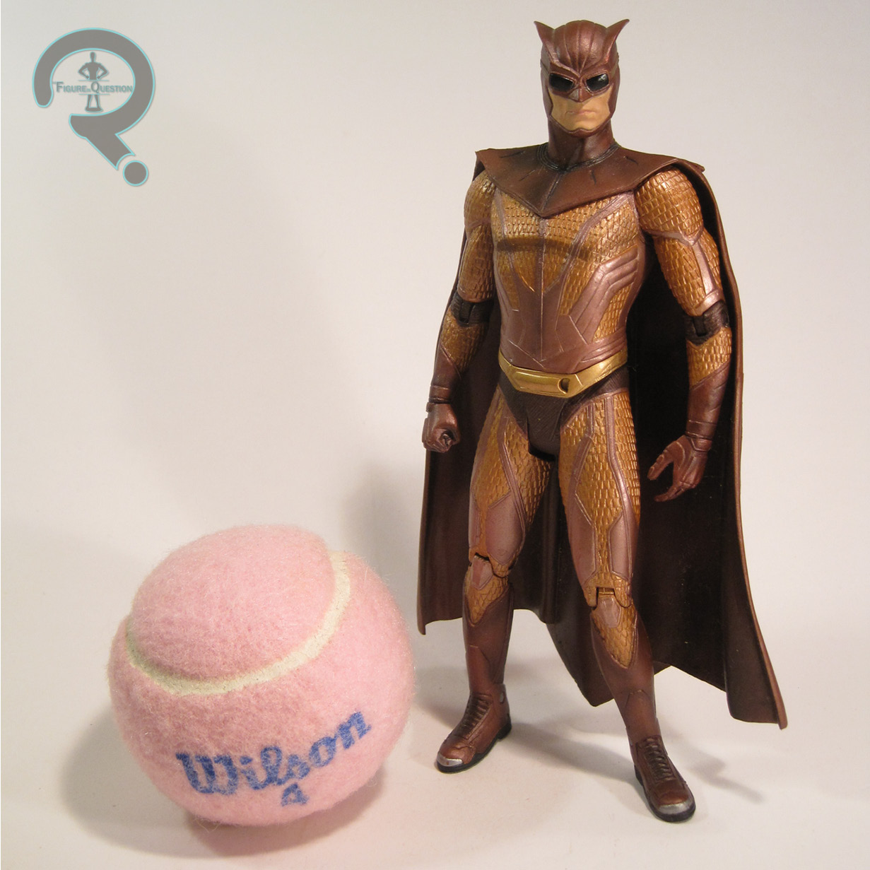 Nite Owl was released in Series 1 of DC Direct’s Watchmen line, hitting shelves just before the film’s March 2009 release.  This one is specifically Nite Owl II, aka Dan Drieberg, who is the main Nite Owl for the purposes of the story (his mentor Hollis Mason, aka Nite Owl I, would follow in the second series of the line).  The figure stands 6 3/4 inches tall and he has 11 points of articulation.  He’s not incredibly poseable, but he’s fairly standard for a DCD offering of the time, and was one of the most mobile figures in this first assortment.  Nite Owl was an all new sculpt, based on his design from the film.  His look was one of the most changed for the movie, shifting from the comic’s more loose-fitting, kind of basic spandex get-up, into something more like the suits seen in the ’90s Batman films.  The general appearance notes of the design are the same, and it reads as more or less being the same guy, so I think it actually works out alright.  The actual quality of the sculpt is actually pretty darn solid, and I’d again rank him as probably the best in the first series.  The proportions are pretty realistic, the smaller detail work, especially on the main body suit, is all really sharp, and what we can see of his face has a passable Patrick Wilson likeness.  The articulation is also worked in without breaking things up too badly, so it ends up looking pretty alright overall.  The paintwork on this guy is generally pretty good.  It’s fairly involved, with all those different shades of brown.  The application’s all pretty clean, and I definitely dig the metallic colors.  He definitely pops.  Nite Owl was packed with a removable crescent blade on his belt (which he can’t hold, and which fell off of mine and went missing while he was in storage), and a display stand that interlocks with the rest of the figures from the line.