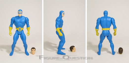 Blue Beetle is one of the four figures produced for Wave 4 of the Amazing Heroes line.  He was produced to demand, and he and the rest of his compatriots started arriving to backers in late June/early July. The figure stands 4 1/2 inches tall and he has 5 points of articulation.  As with the rest of the line, Blue Beetle is built on a centralized body, patterned on the old Secret Wars bodies from Mattel.  He uses the core body and the bald head piece.  He also gets a little bit of new tooling for his arms, which now sport flared gloves.  It’s a small touch, but it does a lot to make him feel just a bit different from the earlier releases.  In general, this figure’s construction is nicely consistent with the more simplistic and basic feel of the rest of the line.  It definitely works well with Blue Beetle’s design.  The paint work is likewise pretty basic and simple, but it again works pretty well to convey the design.  They’ve opted not to do any hinting of his scale-mail, which seems like the right call, and is also consistent with the Secret Wars stylings, since Cap was the same way.  The application is all really sharp, though, which looks great.  Beetle is packed with an extra unmasked Dan Garret head, which is a repaint of the Captain Action head.  It’s a decent enough match for him, and it’s just nice to have the option.