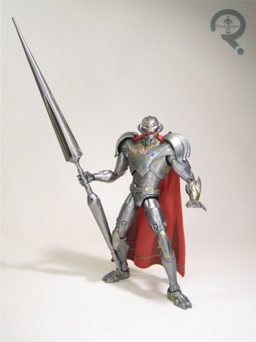 Infinty Ultron is the Build-A-Figure for the third Disney+ themed assortment of Marvel Legends.  In a bit of a shuffling around, he’s actually the only What If…? figure for this assortment, wedged in between two assortments that actually have quite a bit of What If…? coverage.  This guy is based on Ultron’s fully armored up, multiverse conquering attire, which gives him back that classic Ultron look, while still having him in the Vision body.  It’s a pretty strong look, mixing elements of his MCU and a few of a his comics looks, into one sort of cohesive design.  The figure stands 6 3/4 inches tall and he has 29 points of articulation.  In terms of articulation, Ultron’s rather a bit restricted.  There’s definitely an aspect of it that’s brought on from adapting the show design, but it also just doesn’t quite land in a few spots.  The shoulders are particularly confined; I feel like they might have worked out a bit better id the shoulder pads were mounted to the arms, rather than the torso.  The mid-torso joint doesn’t get much motion either, and coupled with the lack of a waist joint, and the general lack of mobility on the hips, makes his whole middle quite stiff.  His elbows also don’t quite bend all the way back, which feels a little odd.  All of it just feels like it was designed independently, so there’s just a general lack of flow to the movement.  His sculpt is an all-new one.  It’s not bad, but it’s not amazing either.  Generally, it looks okay, and it’s rather accurate to the source material.  I do feel it’s a little soft on some of the detailing, and I was certainly bummed by his face plate being sculpted in place.  Beyond that, though, I do like its overall look, and I do feel like it captures the general feeling of the character pretty well.  In particular, I actually quite like how the cape turned out.  The slight swept look gives it just a little bit of flair, without being too crazy. Ultron’s color work is passable; again, nothing amazing.  The bulk of him is molded in silver plastic, swirls and all.  It’s okay, but it doesn’t really help with bringing out the sculpt’s details.  The little bit of painting he gets is generally pretty nice.  The most curious application is definitely the shading on the inside of the cape; there’s no other dynamic or cel shading present on the figure, which makes this stand out.  It’s not bad, but it’s certainly odd.  Ultron gets his big javelin/spear thing as an accessory.  It’s impressively sized, and gives him his most basic extra.  I’d have liked to maybe get an extra set of hands, or an alternate head, but I suppose you can’t expect too much out of a Build-A-Figure; he’s kind of already an accessory himself.