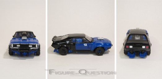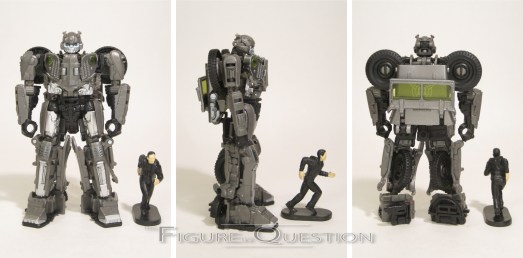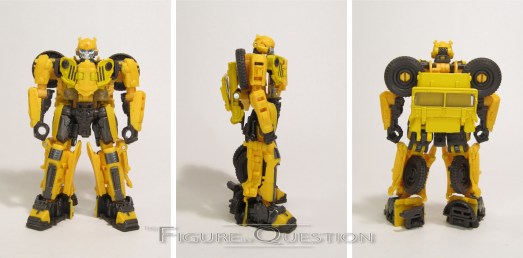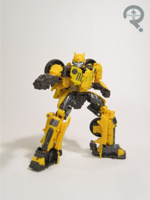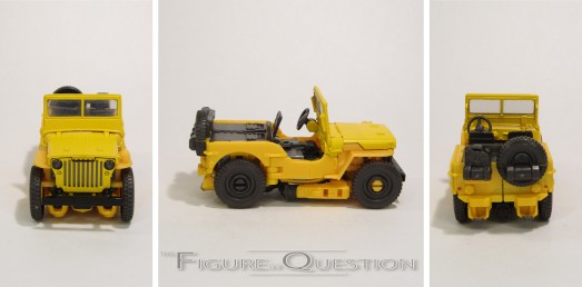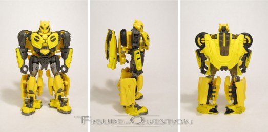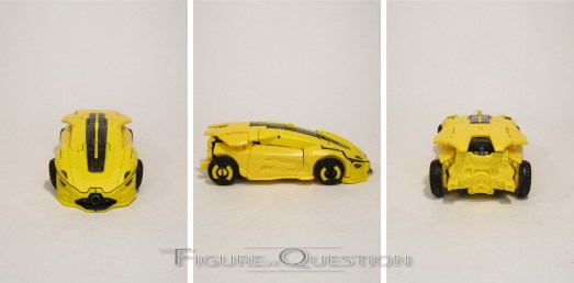 Bumblebee was a re-deco of the Age of Extinction High Octane One-Step Changer Bumblebee. It’s *a* movie Bumblebee, but it’s not the one seen in the movie at all. I mean, I guess it *kinda* works for Bee at the very end of the movie. Ah, I’m overthinking it. In robot mode, he’s about 4 1/2 inches tall and he’s got workable articulation via universal joints at the shoulders. He’s not very mobile, but that’s not what he was designed for. He gets an okay approximation of his later film robot mode, albeit a bit chunkier, and with some notable hollow spots. Again, given that he’s built for play more than accuracy, it’s not bad. His transformation is, as advertised, one step. Essentially, he folds and unfolds much like a butterfly knife, with the top of the car/chest being spring-loaded to flip it into place for each respective mode. It’s admittedly pretty fun. His main change-up is the color scheme, which sticks more closely to classic Bee than the initial release, which was predominantly black.