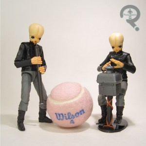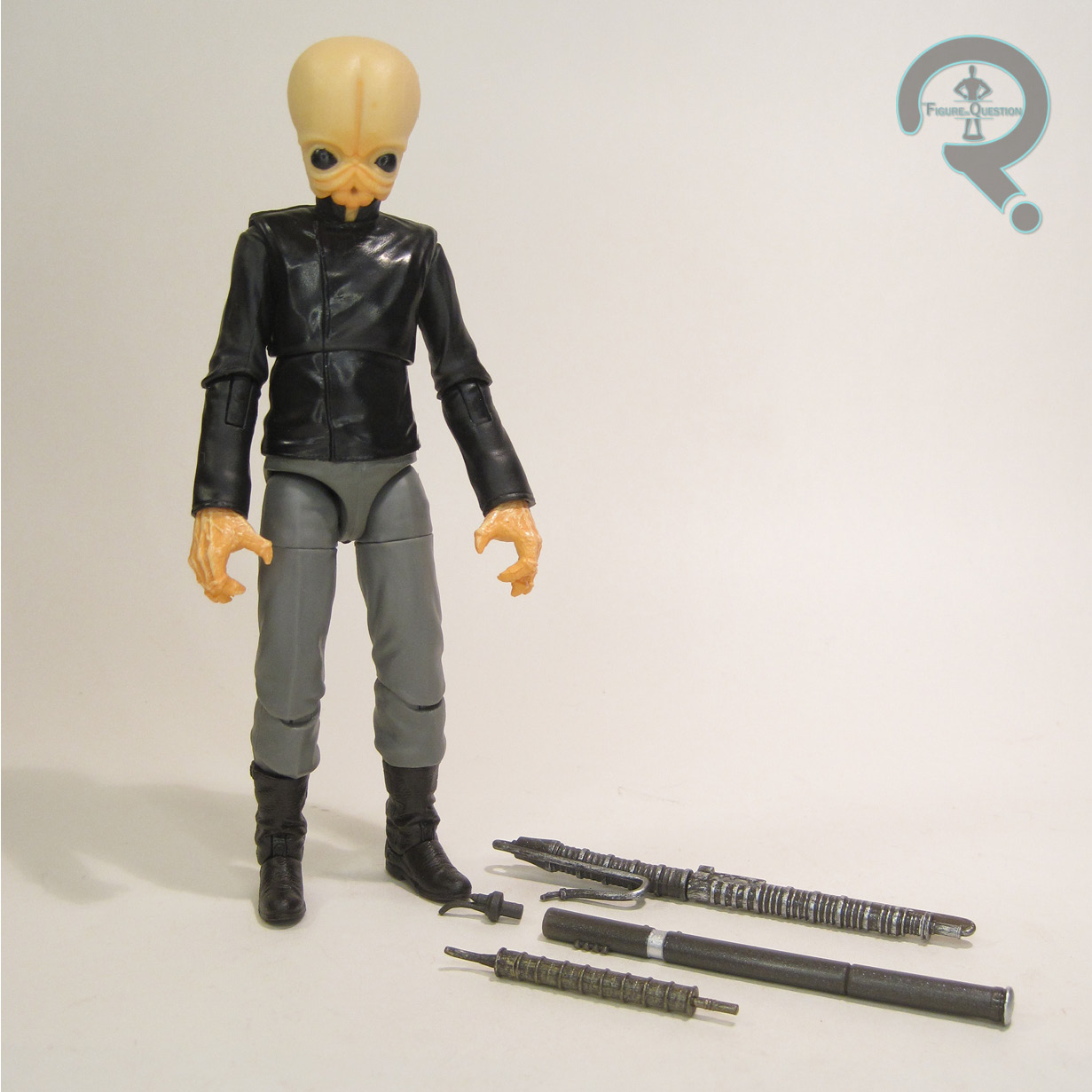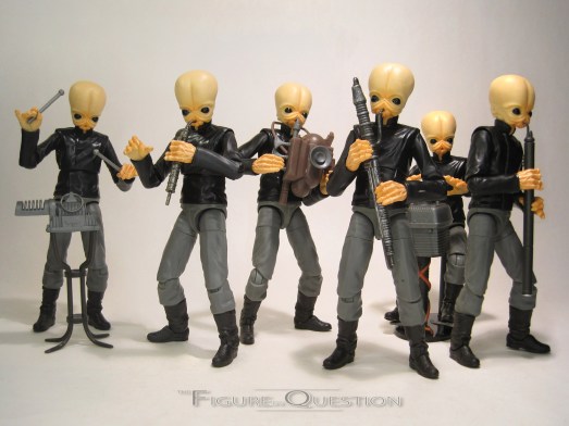 proper, the head’s definitely the strongest work, capturing the look of the masks from the movie quite well. The outfit seems to be the closest Hasbro’s gotten to the actual Modal Nodes attire of all the figures they’ve done. It looks quite sharp, and I really like that. The paint work on the core figure is well-handled. Obviously, the outfit is basic, since it’s just flat black and grey. The accenting on the head and hands is impressive, and really sells the detailing of the sculpt, and gives him a more lifelike quality. Accessories mark where these two figures differ. Figrin is the more basic release, so he gets his Kloo Horn, as well as a Dorenian Beshniquel (the slightly longer oboe-looking thing, played by Doikk Na’ts), and a Double