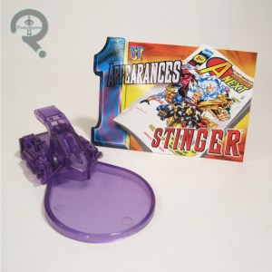 Stinger was released in the PX-exclusive Marvel Comics 2 1st Appearance series, which hit in 1999. This was our first Cassie figure, but not our last. We’ve even gotten Stinger as a Marvel Legend (though, officially she was the mainstream Cassie, but still). This was still the first one, though. The figure stands about 5 inches tall and she has 14 points of articulation.  Stinger, like American Dream, is built on the Vindicator base body.  It’s a decent enough starting point.  Perhaps a little bulky for Cassie, but it’s her MC2 version, so she’s supposed to be a little older.  She gets a new head, forearms, and a modified torso to add attachment points for her wings.  The head seems a little bit small, especially since it’s supposed to be helmeted and all, but it’s decently sculpted beyond that.  The new forearms add her gauntlets, which are pretty nice, and something notably not featured on her later Legends figure.  The new torso and wings are decent enough, though the actual joints on the wings are a little loose.  Stinger’s color work is pretty solid.  The application of the paint is all pretty cleanly handled, and like American Dream, she’s got some pretty cool accenting.  Her skin tone is a little inconsistent, but beyond that it all looks pretty good.  Stinger is packed with a launcher base, re-used from Invisible Woman, but in translucent purple, as well as a trading card.