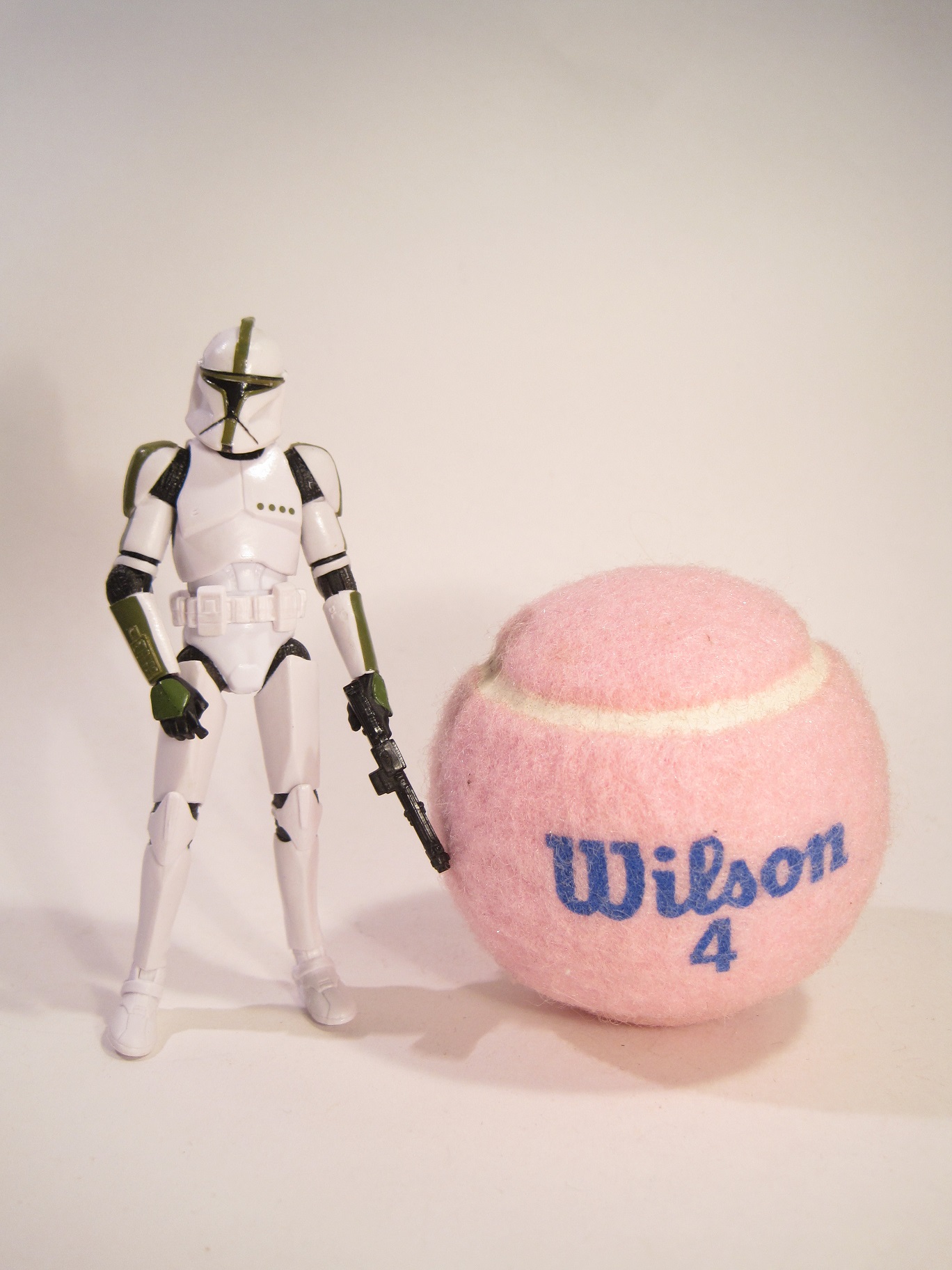 Commander Doom was released in the second series of the 2014 round of the 3 ¾ inch Star Wars: The Black Series figures. Did you get all that? Should I repeat it? Yeah, Hasbro’s release schemes are just a tad confusing. Commander Doom here is based on his appearance in the Star Wars: The Clone Wars episode “The Unknown,” where his animation model was based on Dr. Doom, the Marvel Comics character. One has to wonder if Commander Doom has some sort of rivalry with Clone Commander Fantastic; that would be nifty. The figure stands just over 3 ¾ inches tall and has 24 points of articulation. Sadly, it seems that Hasbro’s cutting back on the articulation of the smaller-scale Black Series stuff again. Doom loses both the ball jointed hips and the mid-torso joint of prior Clone Troopers, which is a bit of a bummer to say the least. It might be hard to tell under that non-standard paintjob, but Doom’s armor is mostly standard issue stuff. He’s wearing a modified form of the Phase II trooper armor, with a visor/antenna added to his helmet (in a similar fashion to Commander Cody) and a battle “skirt” thing, which has holsters for his blasters. It’s worth noting that, while Doom hails from an animated show, this figure has been sculpted to fit in with the more realistic figures that make up the rest of the line. With that in mind, Doom’s sculpt does a pretty good job of taking his design from the show and translating it into “real life.” The sculpt is a little softer than I’d like in some areas, but it’s nicely handled overall. I’m still not 100% sold on the look of the wrist joints, but that’s a minor issue, and the movement they provide is certainly enough to warrant their inclusion. Now, this is a Hasbro figure, which means that, no matter how good the sculpt may be, the paint is likely to be a letdown. While I certainly wouldn’t say this figure has the worst paint I’ve ever seen on a Hasbro figure, he’s still got more than a few occurrences of bleed over and slop. Also, his arms and legs are just molded in a slight off-white, as opposed to being grey due to scuffs and dirt, which robs him just a bit of his uniqueness. Aside from those issues, I will say Doom’s a pretty vibrant figure, especially for a Star Wars figure, and I enjoy how the various customizations to his armor have been carried out. Doom is packed with a pair of blaster pistols, which can be held or stored in his holsters. This feels a little light, especially for the higher Black Series price.
