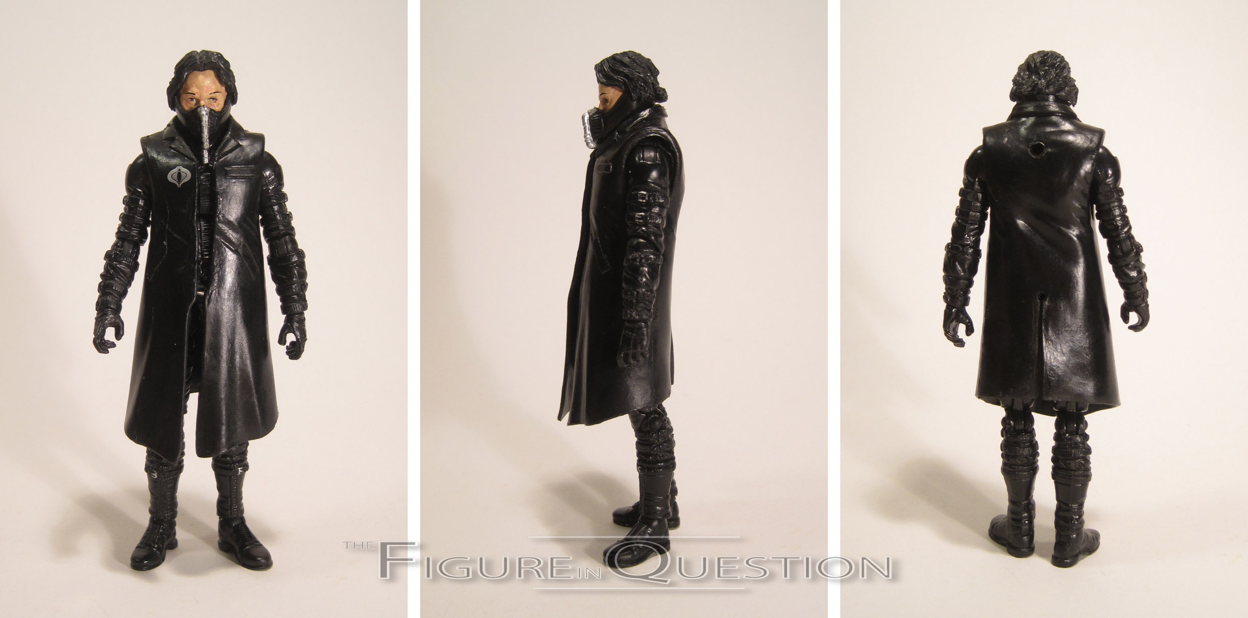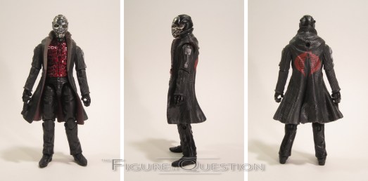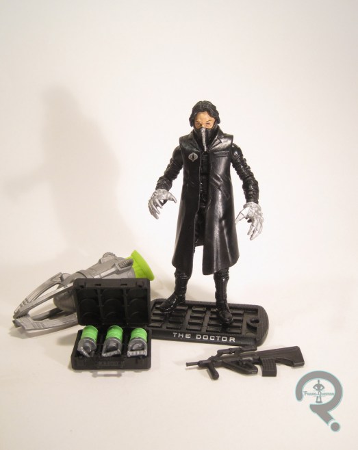 Rex “The Doctor” Lewis was released in the third series of Hasbro’s G.I. Joe: Rise of Cobra tie-in line, which hit a little while after the film’s release.  Presumably, he was in a later assortment so that the reveal that he was Baroness’s not-quite-dead brother Rex could be kept secret.  The figure stands about 4 inches tall and he has 22 points of articulation.  The sculpt for the Doctor was all-new to him, and as far as I know, it’s not been re-used (well, apart from the labcoat, which has shown up on a few figures).  The sculpt is certainly different.  Hasbro opted to not be 100% faithful to the film’s version of Rex, who dressed more like an actual scientist (well, apart from the headgear).  This figure has some sort of  Edward Scissorhands get-up.  Which, with the addition of the jacket, ends up looking about the same as the movie design anyway, so I guess it didn’t really matter.  The head stays pretty faithful, apart from the loss of the monocle thing.  The hair and breathing apparatus are both removable, allowing you to view the fully unmasked Rex, who actually looks a fair bit like Levitt in the scar make-up from the film.  Despite being removable, the hair and rebreather fit pretty tightly to the head, and look pretty decent overall, and they also both stay in place really well, which is a definite plus.  The paint on the Doctor is largely confined to the head (everything else is mostly black plastic).  The detail work is actually pretty great, and they convey the scarred nature of his skin quite nicely.  The Doctor is packed with a pair of claw gloves, a giant nanite-injector claw-thing, a pistol, a rifle, a briefcase with three containers of nanites, and a display stand with “THE DOCTOR” printed on it.  Not a bad assortment of extras!  The case with the nanites and the claw gloves are definitely my favorites, but they’re all pretty fun extras.