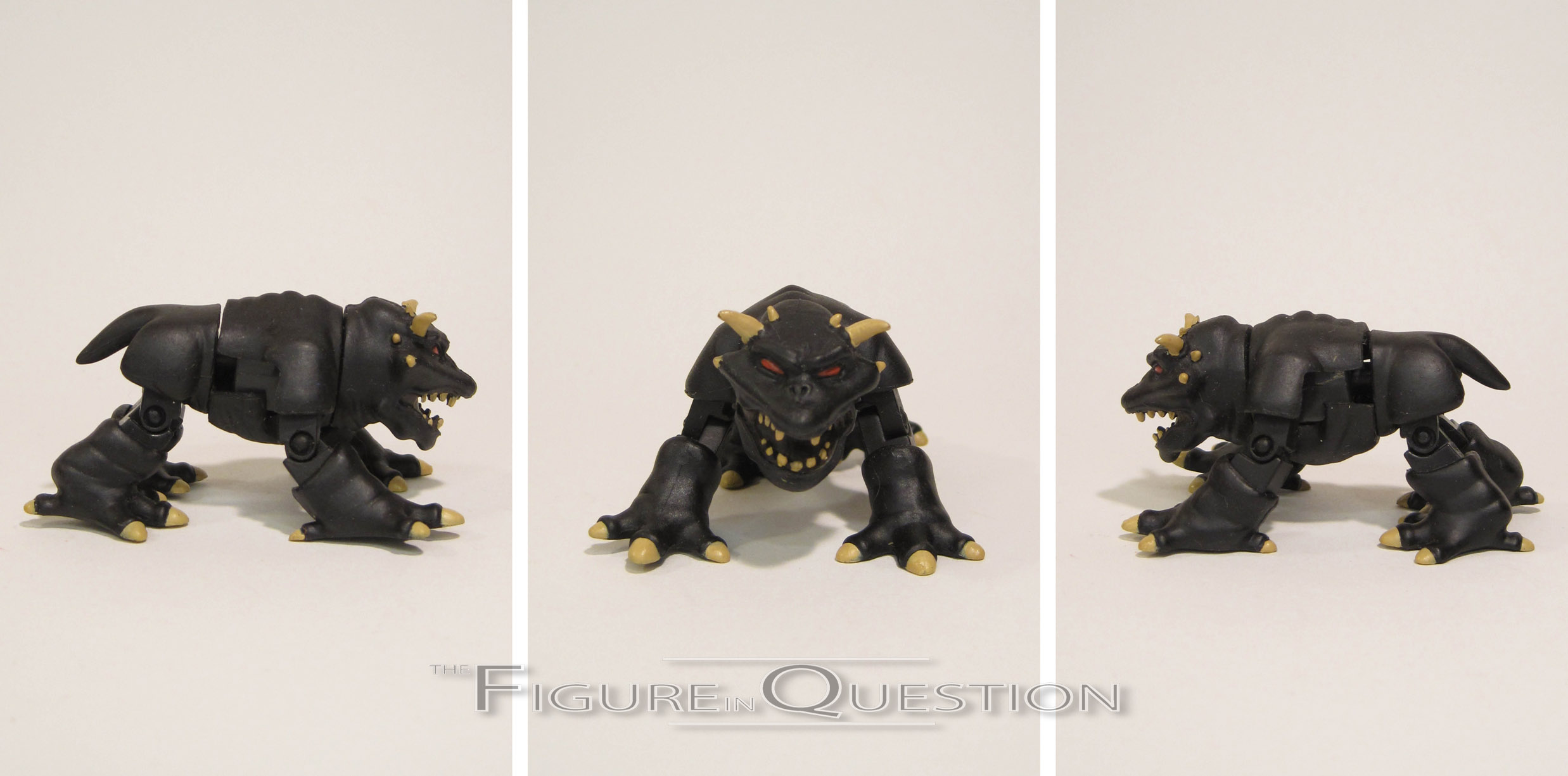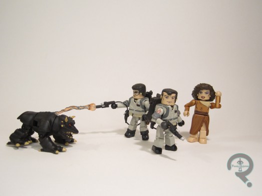 Dana is figure 5 in the first assortment of Plasma Series figures. Like most Dana figures, she’s based on her appearance while possessed by Zuul, which is a sensible enough choice as far as memorable looks go. It’s perhaps not the easiest to translate into toy form, but we’ll discuss that more in a moment. The figure stands a little over 6 inches tall and she has 27 points of articulation. Dana’s articulation isn’t quite as practical or useful as that on the ‘busters. The skirt does a lot of limiting on the legs, and the elbow joints in particular don’t have much range at all. These are, of course, the symptoms of adapting such a design into plastic, since her rather flowy and lightweight dress doesn’t really translate into plastic all that well. And really, that’s kind of the overwhelming thing that you run into when dealing with this figure: it’s translating a design that just doesn’t translate so well. There are parts of the figure, particularly on the torso and arms, where they’ve made some design compromises so as to not impede articulation quite as much, and it doesn’t really work. I mean, I like that the arms are separate pieces, thereby allowing actual movement, but ultimately they’re separate pieces, and very obviously separate ones at that, which don’t look like the single piece of clothing from the film. Instead, she kind of looks like she’s wearing separate sleeves or something. Moving away from the hard to translate flowy dress, let’s talk about the hard to translate poofy hair. Sigourney Weaver’s hair later in the film is…well, there’s a lot to it, and it behaves in ways that really only hair can do. When you try to make that into a solid piece of plastic, changes have to happen. And that they did here. The actual face does sport a solid likeness of Weaver, but the hair around it seems strange. She’s definitely got some helmet hair going on here, and it doesn’t really look right from any angle. I can see what they were going for, but it just ends up looking strange, and just off. It’s the weakest part of the figure, because it just never looks right, no matter how you pose her. One area where the figure actually does pretty well consistently is the paint. The face uses the printing, which works quite well for her heavy make up, and I quite dig the metallic sheen on her dress. I would have liked for her sash to have a little more accenting or something going on, but it’s not atrocious as is. Dana’s only accessory isn’t really anything for her, but is instead the torso of the Terror Dog Build-A-Figure.