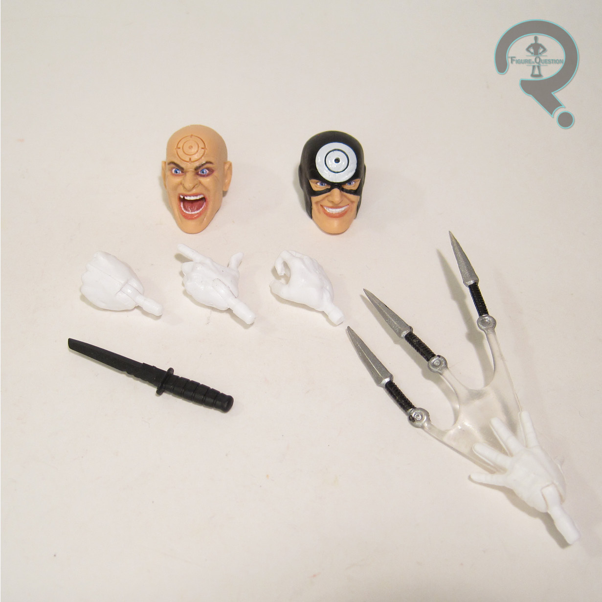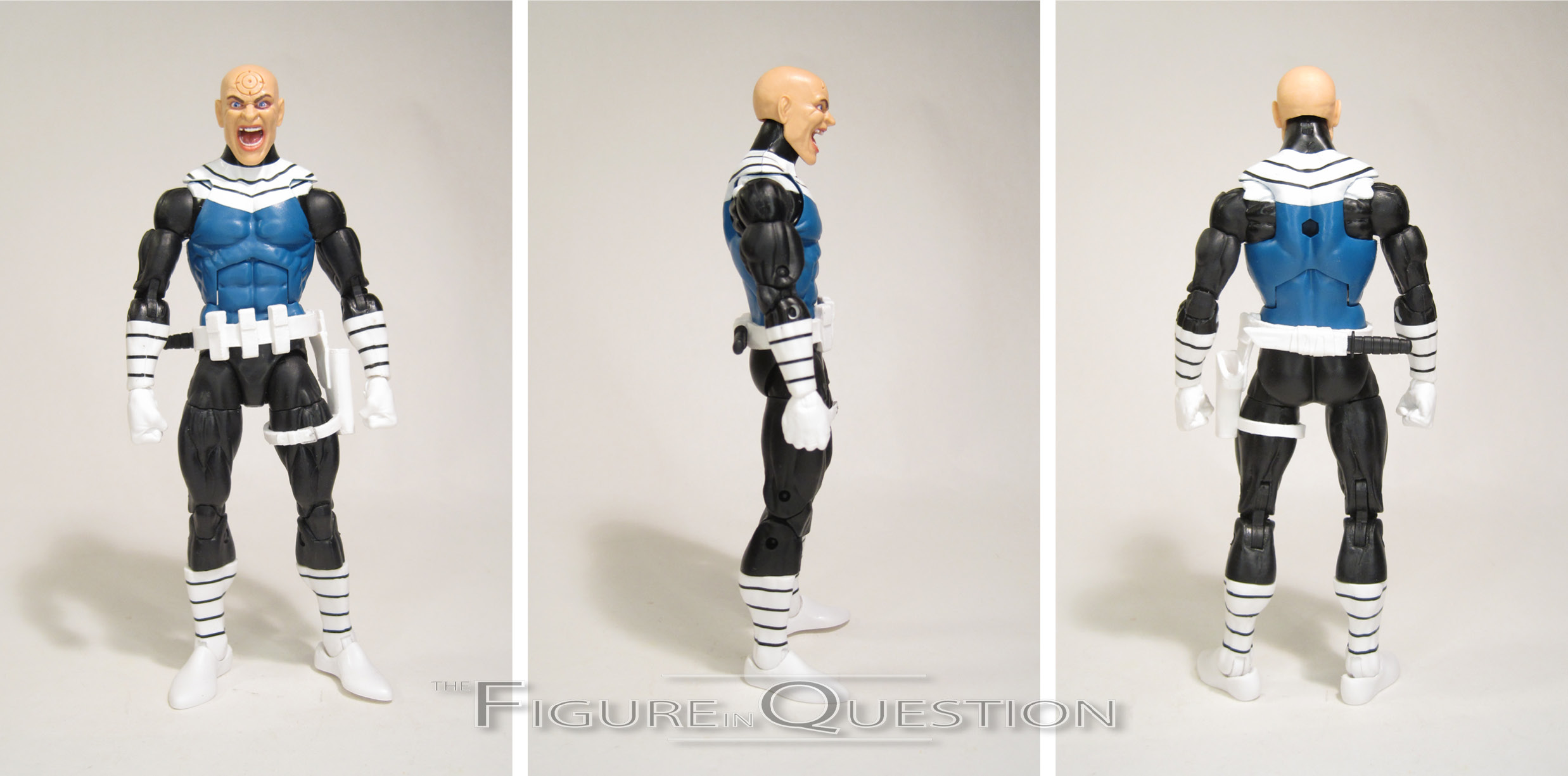 Bullseye has a tendency to go some distance between Legends releases; his last one was in 2017, which isn’t the same distance as the 12 year gap before that, but it’s still notable. Unlike the other two in this set, Bullseye’s not really designed to be drastically different from what came before. In fact, sculpturally, he’s exactly the same as the last one, meaning he’s still about 6 inches tall and he has 34 points of articulation. The sculpt wasn’t bad the first time around, apart from the head seeming maybe a touch too large, and it’s generally held up okay. The paint work was one of the weaker aspects of the last figure, so this one aims to change that up a bit. They actually adapted a slightly different design this time around, going for his look from his 2017 solo series. The only real change-up from the classic design is the blue torso section. It’s different, but I don’t hate it. The actual application is *a lot* cleaner this time, and it does head sculpt a lot of favors. Bullseye is packed with four hands (right gripping, and left fist, finger gun, and knife throwing), an alternate unmasked head, and a knife. They have notably removed the pistol from the prior release, which wouldn’t be a big deal if it weren’t for the empty holster that is attached to his belt. Like…what are you supposed to do with that? The stock photos stick the knife in there, but that just moves the problem, since then he’s got the empty sheath on the back of the belt.