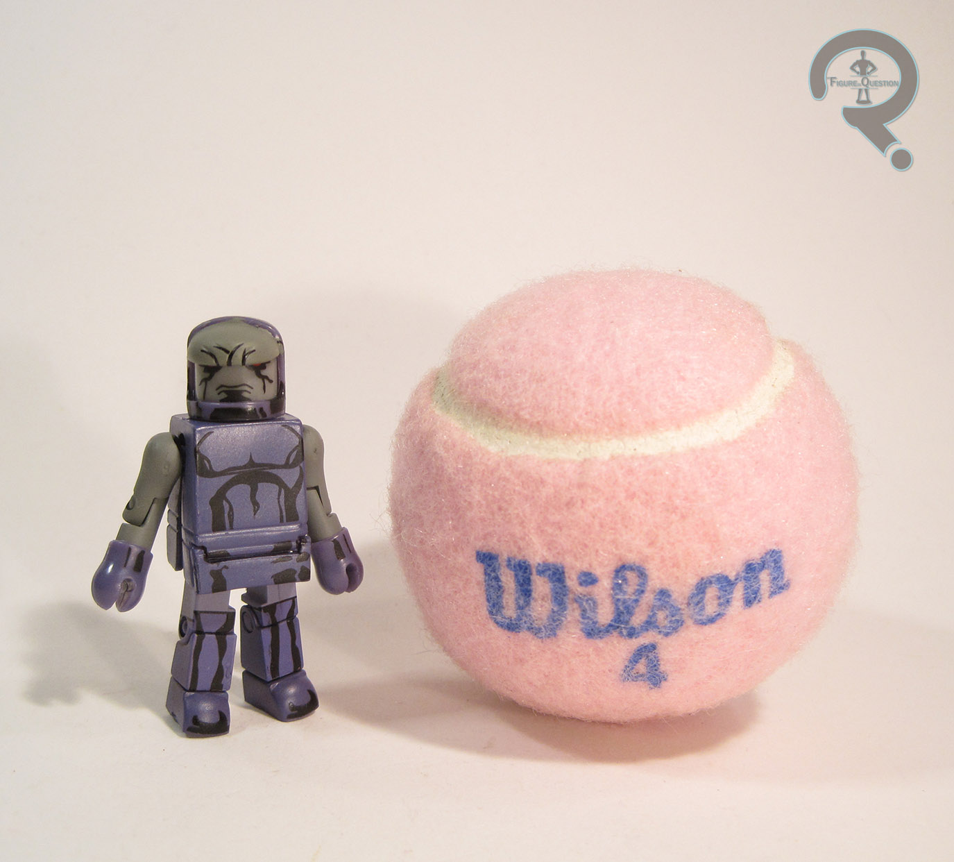 In contrast to his pack mate Superman, this is the only Darkseid Minimate we ever got. Like Superman, he’s patterned on his animated design, which is admittedly less noticeable on him, since Bruce Timm and Jack Kirby’s styles are pretty similar. The figure is also built on the basic ‘mate body, so he has the same basic height. He does get one extra point of articulation courtesy of his sculpted chestpiece, which has an articulated skirt so that he can sit a bit better. He also gets sculpted add-ons for his headpiece and gloves. In general, the pieces show their age a lot more than those seen on Superman, which is something of a shame. Also, the use of the smaller body, without any real attempt to bulk him up (apart from the chest piece) robs him of a lot of the character’s presence, and ends up making him look rather goofy. The paintwork on Darkseid is decent enough. The line work is all pretty sharp, and makes use of the space well, and I quite like the slight metallic finish of the purple bits. It doesn’t really line up with his animated design, of course, but whatever.