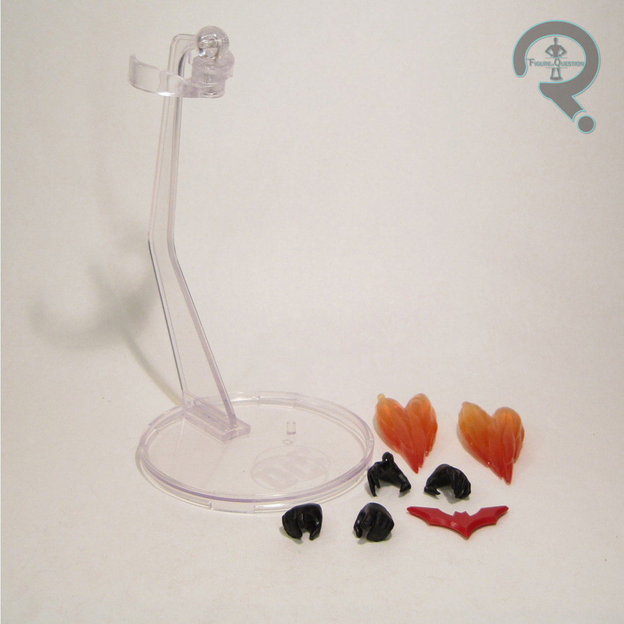 eyes. The crazier, more exaggerated facial expression works a lot better for the character, especially in toy-form, and the texture work on the outfit is pretty solid. McFarlane certainly does torn-up and gritty well. I also feel that the more posed hands work a lot better for the character than the more generic gripping hands of the prior release. The most obvious change here, of course, are the wings. They actually work quite nicely, as they’re well-articulated, well-detailed, and not terribly balanced considering. It would be nice to see such work on a proper Hawkman, but this is McFarlane, so a Batman variant is really the best we can hope for, I suppose. The paint work on this figure is generally pretty good. It’s largely rather basic work, but I think that’s for the best, especially after the weirdness surrounding the accent work on the last figure’s mouth. It just looked odd, so going a little more straight forward here is probably the right call. The Batman Who Laughs includes a display stand and a collector’s card for the figure proper, as well as the head, shoulder pads, and sword of the Merciless Build-A-Figure.