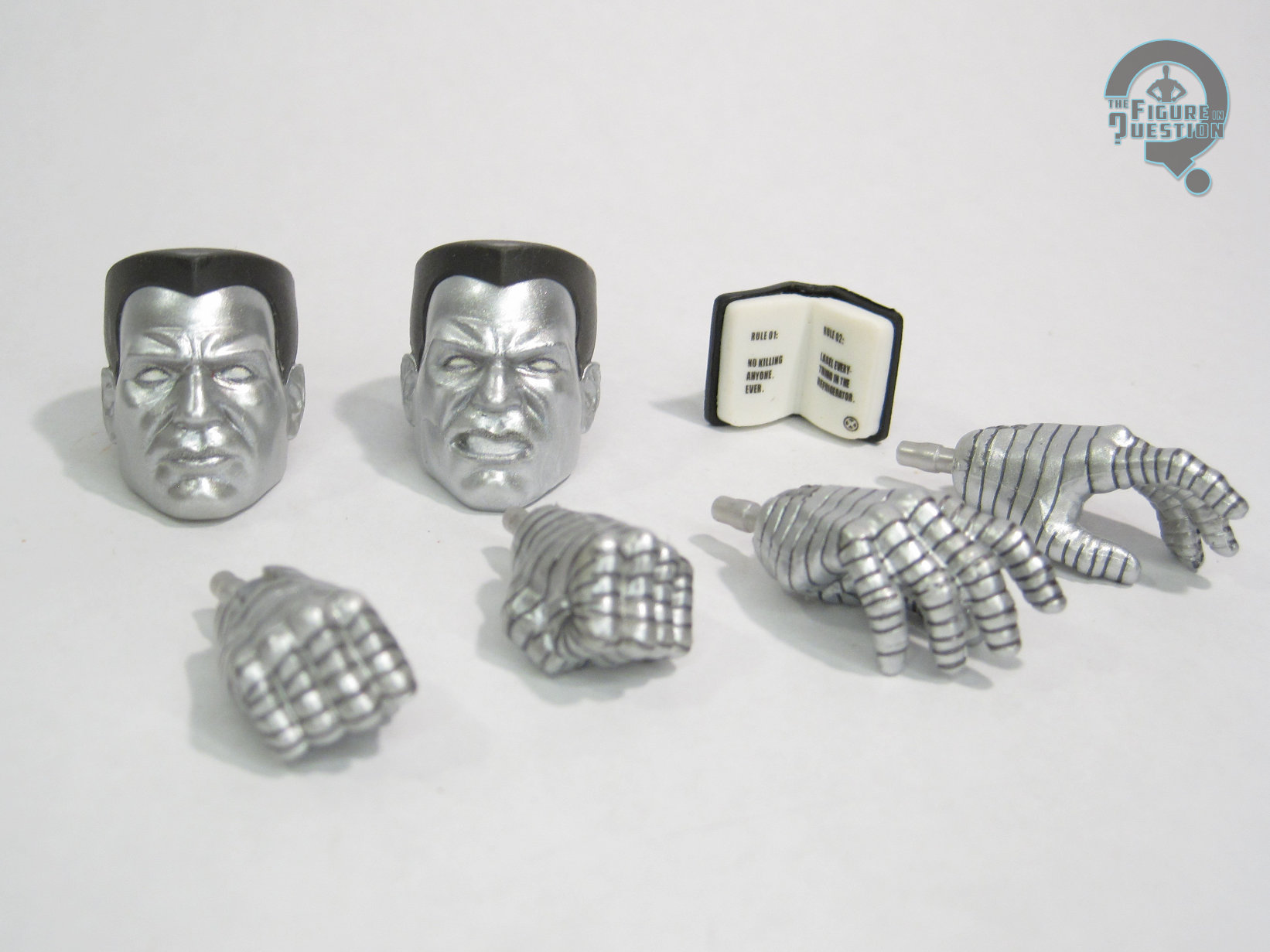 recreation of his look from the movies. In particular, I really like the head sculpt, which just feels appropriately Colossus-y to me (and, bonus points, it’s the same shade of silver and the same neck peg size as the 80th set version, so you can swap it to the classic body if you’re so inclined). Colossus’s colir work is reasonable. The silver is the same used on the 80th figure, and the rest of the application is generally pretty clean. He’s packed with an alternate head, two sets of hands, and his pocket-sized X-Men rule book. The alternate head has his teeth gritted and some slight damage, indicating it’s from his fight with Juggernaut. The rule book has two of the rules actually written out so you can read them, which is a very fun little touch.