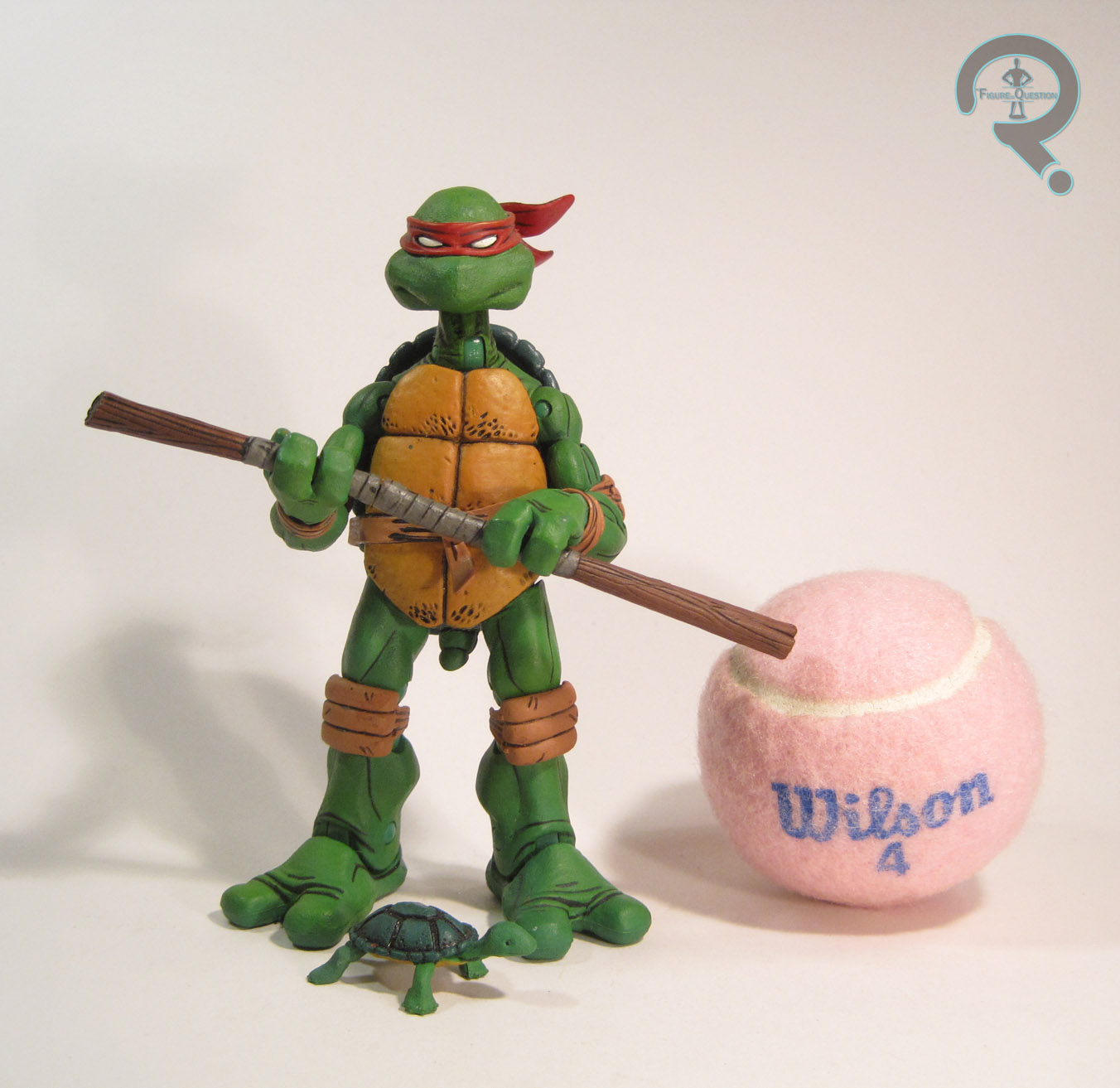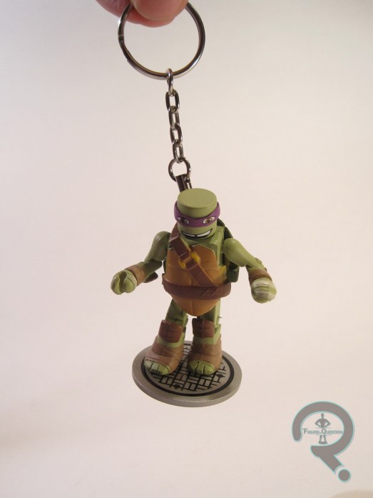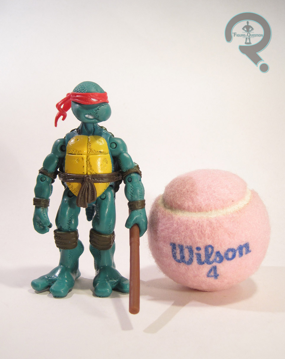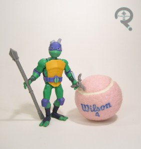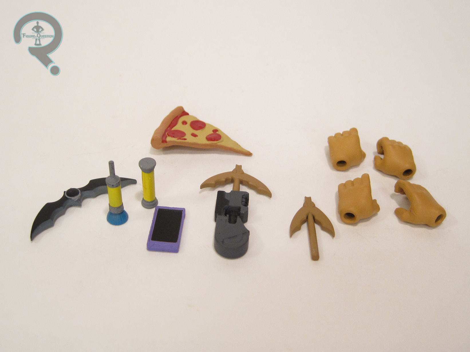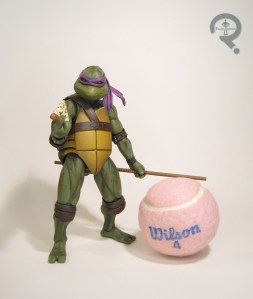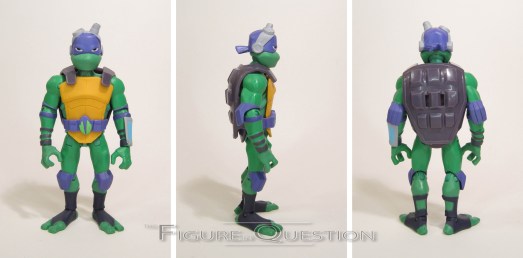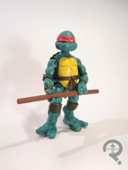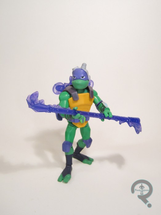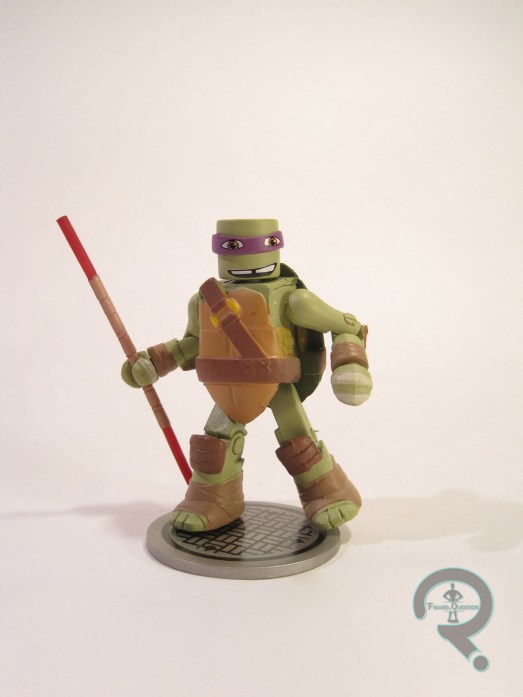 the character thematically, and translates pretty well to the design of the toys. The head does end up looking a little bit off in my eyes, mostly due to it departing the most from that classic Turtles shaping. That said, it’s more a question of finding the right angle for it. Donatello definitely has the best weapon storage of the four, I think largely because it’s the one area where he doesn’t stray from the classic design. There’s a spot on the back where the staff can slide in, and it stays pretty securely, and doesn’t feel like it could snap at any moment. After changing up the coloring slightly for Raphael, Donatello is again approximately the same shade as tho other two. His paintwork is alright. It’s clean, it’s bold, and it looks decent. Donatello is packed with three sets of hands (fists, gripping, and flat), his Bo Staff (which splits in the middle for an easier time putting it in his hands or on his back), an extra helmeted head, a TCRI canister, a shellphone, and another slice of pizza. Now we’re up to seven slices!