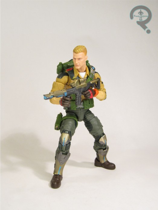 Duke is figure 04 in the G.I. Joe: Classified Series line.  Initially, he was supposed to be heavier packed alongside Snake Eyes, but when the cases dropped to 6 figures instead of 8, he went down to one per case.  It’s okay, though; it’s just Duke.  It’s not that big a deal.  The figure stands 6 1/4 inches tall and he has 37 points of articulation.  In terms of posablilty, he falls between Snake Eyes and Roadblock, being not quite as agile as Snake Eyes, but still getting a little more range than Roadblock.  Much like yesterday’s Destro, Duke’s a more faithful recreation of his old figure than the others in the set.  There are still a handful of changes, of course, to help bring him more in line with the slight sci-fi flair of the rest of the updated line, and to just sort of modernize him a bit.  I know some people weren’t big on the shin armor, but it feels rather Aliens-like to me, and I’m definitely down for that.  The head sculpt has gotten a little bit of flak from collectors who think he either has too modern of a haircut or looks a little too young for Duke.  I myself quite like the sculpt.  It’s got a little bit of a John Cena vibe to it, which actually works surprisingly well.  I also like that they’ve kept the scar that Duke frequently sports (in reference to the original Joes, of course), though it’s been moved up to his eyebrow instead of his cheek.  The overall end result definitely amounts to a very Duke-esque figure, and I can definitely get behind that.  Duke’s paint work is rough; definitely the roughest of this bunch.  My figure’s got quite a bit of slop on his uniform, especially at the top of the shirt and on the gloves.  Like I said, it’s rough.  At least mine has a decent looking face, which I can’t say for every other Duke that All Time got in.  I don’t know if there are line-wide issues with him or what, but he definitely ended up way worse on this front than the rest of the group.  Duke’s accessory selection is almost a match for his V1 figure’s set-up.  He gets a rifle, a pistol, a back pack, and a small pair of binoculars.  The rifle and pistol are again more sci-fi-esque designs, though I really dig how they’ve matched the silhouette of the rifle to the vintage counterpart’s sub machine gun.  I also really like how the binoculars clip onto his belt.  About the only thing this guy’s missing for the full vintage set-up is a helmet, and that’s honestly never been a very intrinsically Duke piece.  I definitely can’t knock what he’s got here.