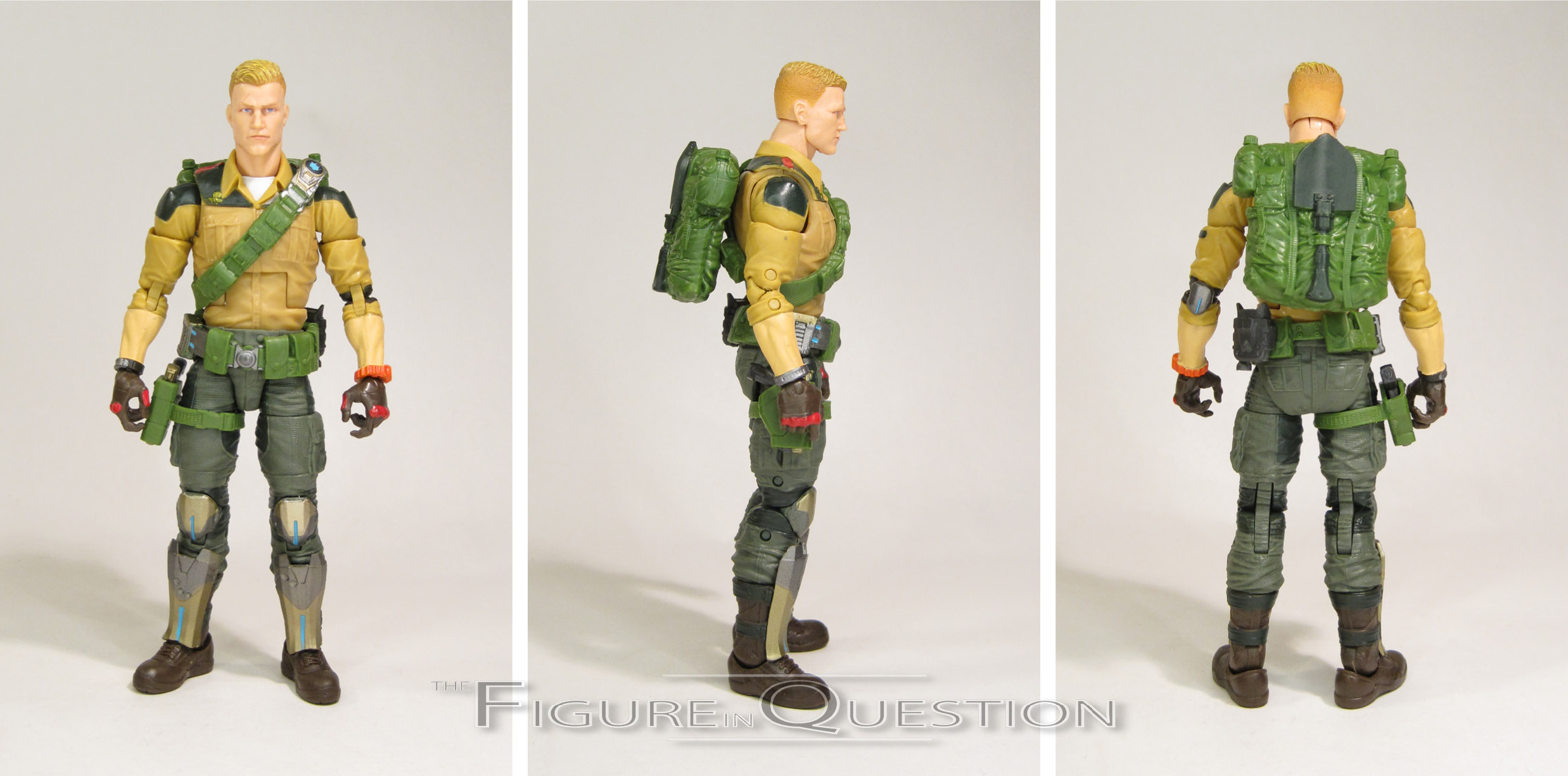 Beachhead rounds out the set as another “constructed to round out the set” figure.  Who…you know…rounds out the set.  Like Stalker, he’s a character that’s present in the show, but not overly prominent.  I don’t actually believe he even has any dialogue.  All that said, he’s got one of the more memorable classic Joe design, so it makes a lot of sense to include him.  The figure stands 4 inches tall and he has 22 points of articulation.  Beachhead is mostly built from the same bank of parts as Flint, with Duke’s arms and legs, and Hawk’s torso and waist.  It’s a decent enough formula for both designs, so more power to them.  He gets a new head and webgear, as well as using the collar piece shared with Stalker.  The new parts are definitely solid, and this head is honestly my favorite Beachhead sculpt to date.  Given that it showed up on every Beachhead figure that followed, I’d say Hasbro agreed. The vest is a nice piece, with the only downside being how freaking hard it is to get his knife sheath back in place once you remove it…which is why mine doesn’t have his in any of the photos.  The collar piece definitely works better here than it did on Stalker, leading me to believe it was designed for Beachhead and then also used for Stalker.  It all adds up to a figure that doesn’t really feel like he’s at least 75% the same as another figure in the set, despite the fact that he totally is.  Beachhead’s paintwork is all pretty decent, apart from that annoying gun/holster issue that I mentioned on both Flint and Stalker.  It wouldn’t annoy me quite so much if they hadn’t properly painted it on only one figure in the set, honestly.  Beachhead included the same rifle as Stalker, as well as a knife, pistol, and display stand.