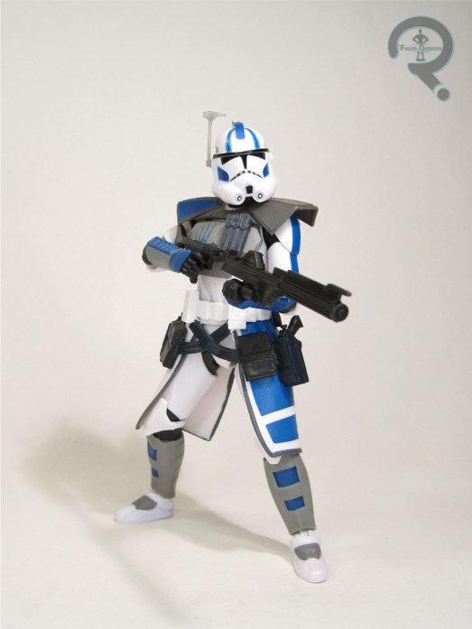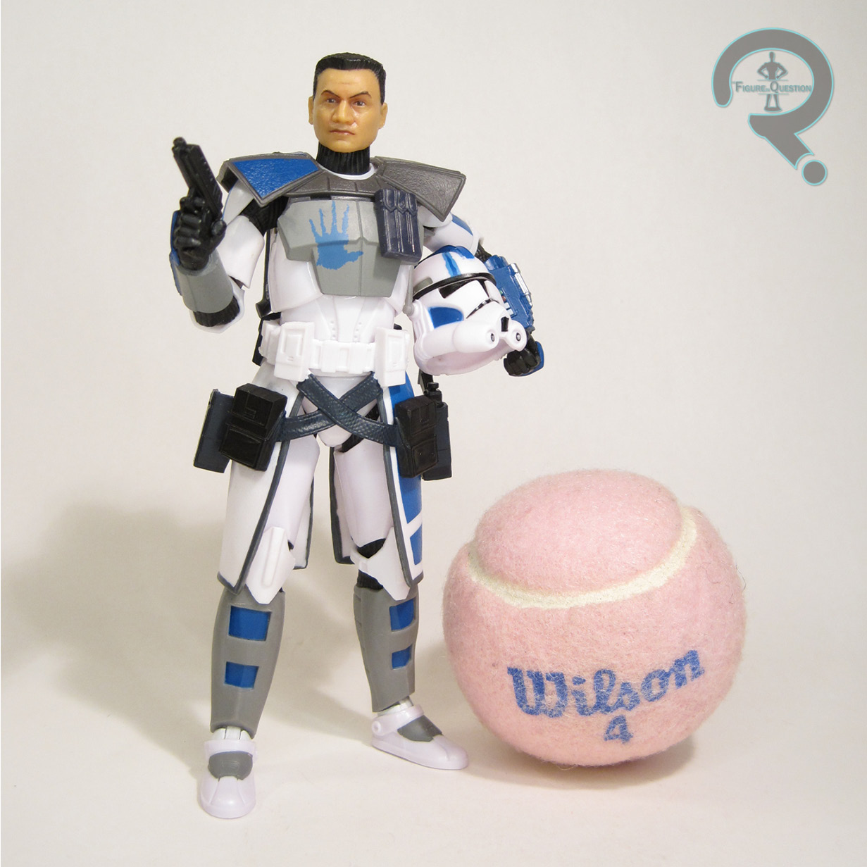 accomplishment this time than the other team members. On the show, Echo’s built-in headgear actually interfaces with his helmet, in a way that’s such a cheat that they never actually show him taking off the helmet on screen from any angle other than straight ahead (i.e. the angle that doesn’t actually show how the parts interface). I was honestly expecting either just an alternate head, or some sort of a tweaked design for either the helmet or the head. Hasbro actually did a pretty solid job of making it work, in almost exactly the way it should work, as seen on screen. Echo’s paint work is pretty much on par with the rest of the team. The paint on the face is convincingly lifelike, and there’s some respectable wear and tear on the upper armor. Echo is packed with his helmet, back pack, a blaster pistol, and a grapple attachment for his right arm. The pistol can be stowed on his left side, which is appropriate, but he’s unfortunately still without a trigger finger on the left hand, so he can’t quite hold it right. The grapple is a fun piece overall, but there’s no actual line connecting the two pieces. It still works as a cool power arm looking thing, though.
