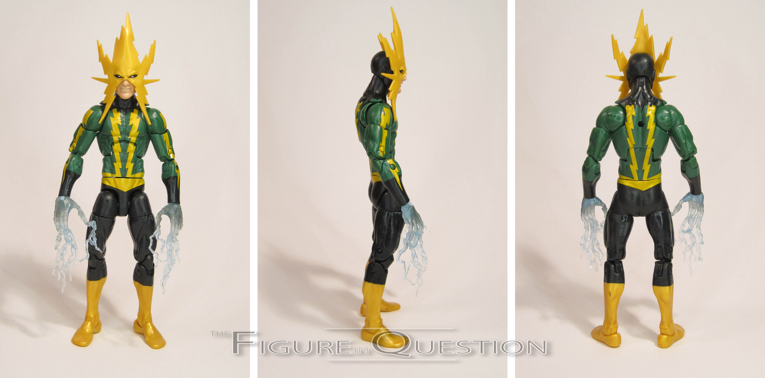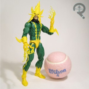 top “bolt” of his mask is folded down. It’ll need some work to get it properly reset. He gets a single piece jumpsuit, with a printed pattern matching his classic costume set-up, and additional pieces on the forearms mimicking the bolt attachments from his gloves. He also gets a standard pair of boots, molded in yellow.