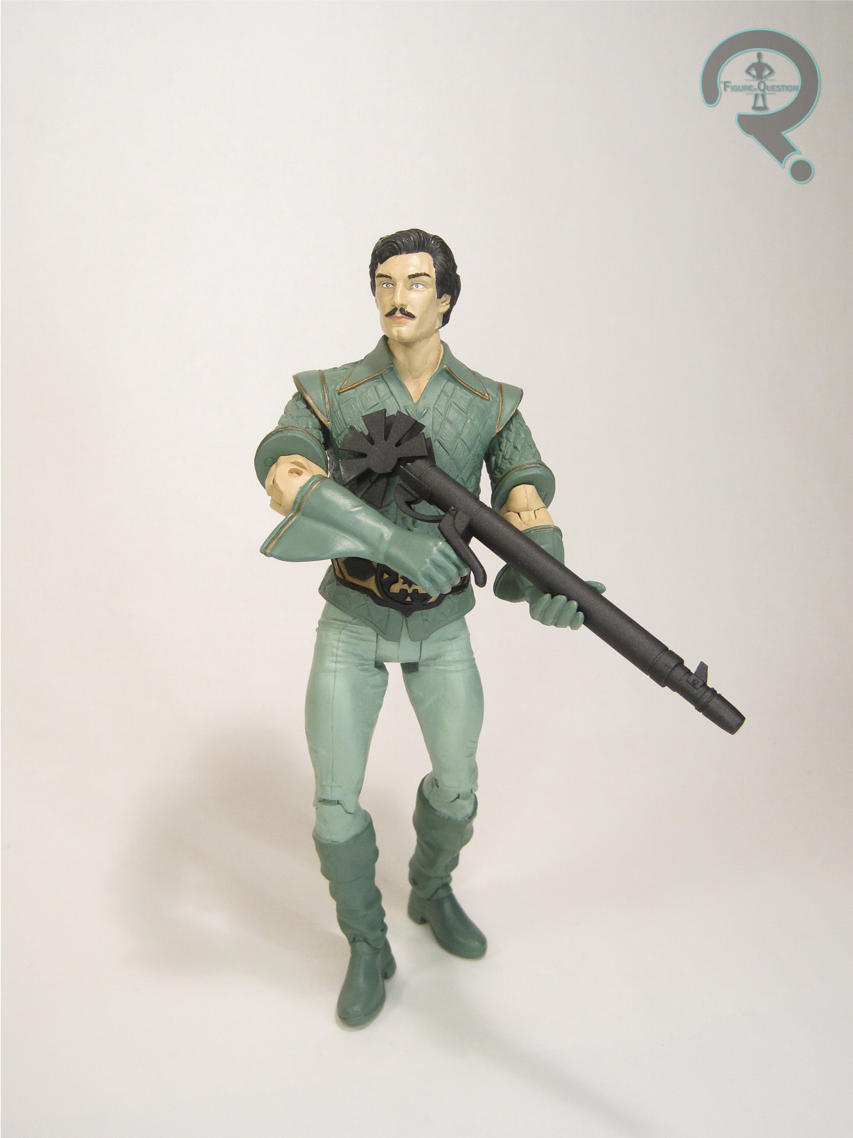 Prince Barin was released in Series 2 of Bif Bang Pow!’s 7-inch Flash Gordon line from 2008.  This is the standard release, but there was also a battle-damaged exclusive that depicted him from his duel with Flash in the throne room of the hawk people.  Both of the larger Barin figures depicted him in his more battle-ready attire, which is what he spends most of the movie wearing, and is also his more Robin Hood-esque design.  The figure stands 7 inches tall and he has 15 points of articulation.  He’s not amazing articulated by current standards, but he was pretty good for a non-Hasbro/Mattel product at the time of his release.  Barin’s pretty easily posed, and the only truly noticeable omission is some sort of wrist articulation.  As it stands, he has trouble doing too much with his hands.  Barin’s sculpt is a pretty impressive affair.  Bif Bang Pow did a solid job of sticking to the source material, and the level of detail on all of these figures was pretty impressive.  Barin’s costume is very nicely recreated, and there’s plenty of sculpted texturing, especially in the quilted pattern of the shirt and the folds of the pants.  The likeness of Dalton isn’t quite as good as some of the line’s other likenesses, but it’s certainly not a bad attempt, and it’s more instantly recognizable as Dalton than Rassilion was.  I think it’s just the eyes that throw it off; they’re not quite right for Dalton’s steely stare.  The paintwork on Barin is fairly basic work.  It gets them main colors down pretty well, but doesn’t really add much depth beyond that.  Like the articulation, this was pretty decent for this style of figure at the time of his release.  Barin was packed with a laser rifle, based on the one he’s carrying late in the film.  It’s kind of a goofy design, and a little tricky for him to carry due to the limitations of his articulation.  Still, something’s certainly better than nothing.