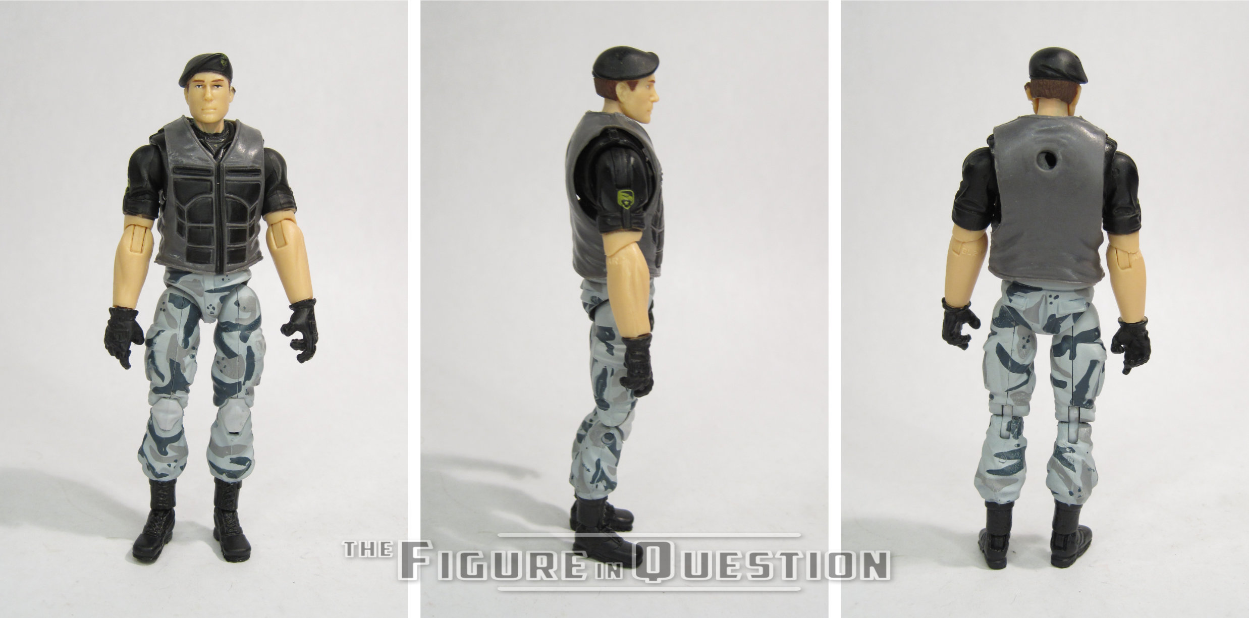 Sgt. Stone was released as part of the G.I. Joe: Rise of Cobra tie-in figures in 2009. The line used a weird and sort of complicated interplay of “collections” and “waves”, and Stone was part of Collection 2 Wave 2…which really just means he was part of the larger push of product made up of the first two waves of both collections that all hit shortly before the film’s release in 2009. The figure stands 4 inches tall and he has 22 points of articulation. He shared his torso and legs with the movie version of Zartan, fitting, since Zartan was in Joe fatigues for his figure. Stone’s construction is the standard 25th style assembly. It’s generally not a bad set-up, although that mid-torso joint always has a tendency to be a bit finicky. Stone’s uniquely sculpted pieces include his head, arms, and the armored vest for his torso. The head doesn’t have a Fraser likeness to speak of; the eyes are too small and too