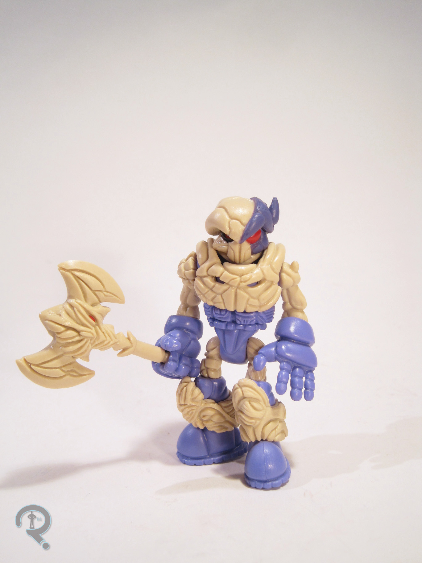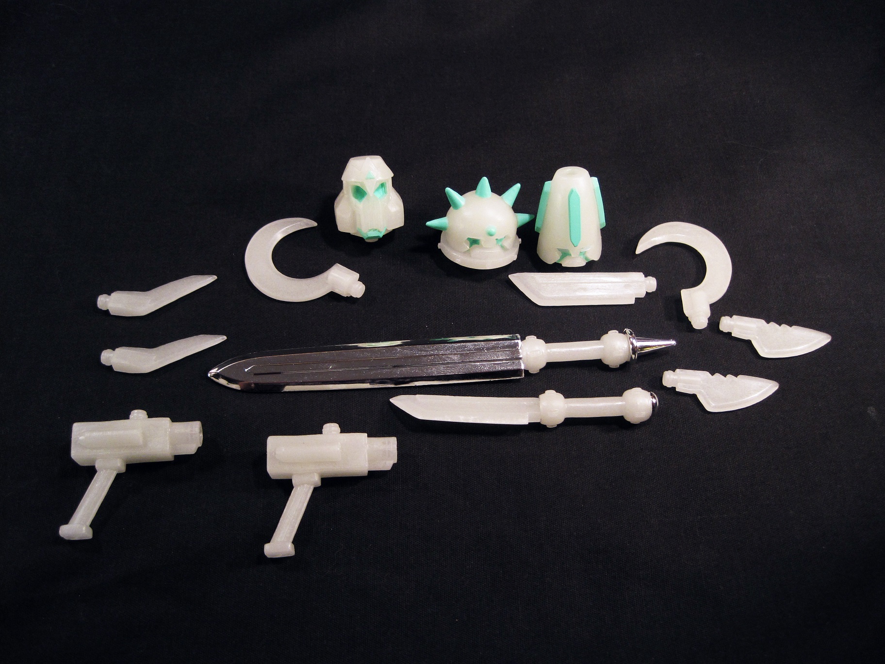 Lifespring Empyreus represents the second look of WoM’s main character Empyreus, leader of the Gearo.  He’s shown here after accessing the “Lifespring energy” to defeat the “Bloodlust” powers held by Umbreus, leader of the villainous Vilhain (How cool is that?).  Effectively, that means he’s cast in glow-in-the-dark plastic, which is always super nifty*.  Every figure in the line is effectively built from the same parts, just cast in different colors and painted differently.  What this means is that, while this is technically a figure of Empyreus, he includes the parts to make him into any of the four main characters, or even one of the army builders, the Gohlems.  This adds a whole new level of fun to every figure, as you’re getting five figures in one.  Plus, three of those heads can also double as hands, adding even more options.  I’ve included a shot of the figure using four of the extra heads in varying capacities to demonstrate.  In his default state, Empyreus stands about 4 inches tall and has 17 (19 if you count being able to move the ear thingy’s on the Empyreus head) points of articulation.  The articulation is a bit different than on most lines, as it’s completely accomplished through simple swivel joints.  However, thanks to the modular nature of the figures, you can actually reconfigure him to get some deeper poses out of him.  The figure is assembled from about 25 different pieces, depending on how you have him laid out.  The sculpting on the pieces is pretty straight forward.  At first glance, it isn’t anything amazing, but after playing with them a while, you realize how much work had to be put into getting pieces to look like completely different parts depending on how they’re oriented.  Empyreus is technically one of Spy Monkey’s DX releases, which means he has some slightly more advanced paint apps than their “regular” line.  The paint is used sparingly, but very well.  There’s no slop, and the colors accent the molded plastic perfectly.  Empyreus includes a small blade and a sickle, molded in the same color plastic as the rest of him.  In addition to the additional paint apps, DX figures also include a vac-metalized piece of some sort.  In Empyreus’s case, it’s a large broadsword.  I liked the broadsword so much I also picked up the separately sold Lifespring Accessory pack, which is why my Empyrous is shown holding two of them.