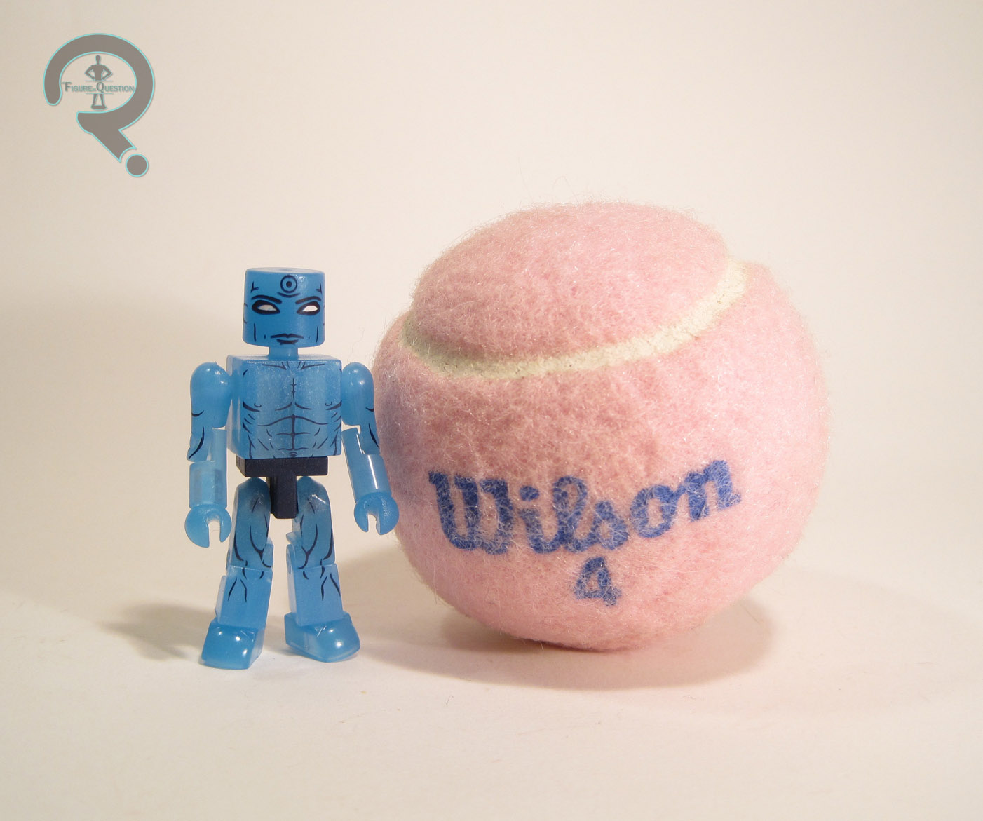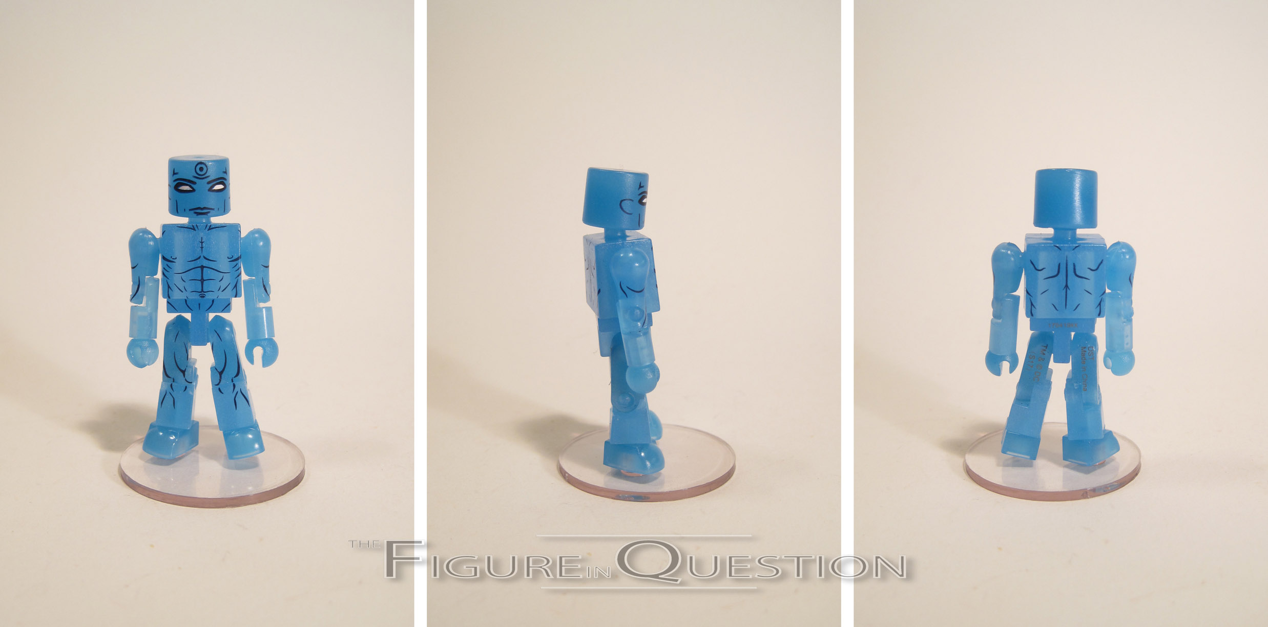 Dr. Manhattan is the story’s one true super human, originally planned to be Captain Atom.  Visually, Manhattan is one of the story’s most memorable characters, and as such, his design remained essentially the same when they adapted the comic to film.  Structurally, Manhattan is just a plain Minimate, with additional parts or anything.  It’s certainly well suited to the character.  It does mean that all of the heavy lifting is handled by his paint work.  He’s done in a semi-transparent blue plastic, which, fun fact, is also glow-in-the-dark.  It’s surprisingly powerful, provided you give it a little time to charge up.  The detail paint on this guy is phenomenal.  All of his parts have detailed musculature, and his face is a spot-on recreation of how he looks in the film.  It should also be noted that this is the first Dr. Manhattan figure to forego the usual black shorts seen on all the merchandise.  I mean, they still Ken-Doll-ed him; he’s still got to be decent and all, since he’s being sold at retail.  Should you want him to be more modest, though, he does include an extra pelvis piece, molded in dark blue, thus replicating the shorts.  In addition, he’s also got the standard display stand, as well as a flight stand.