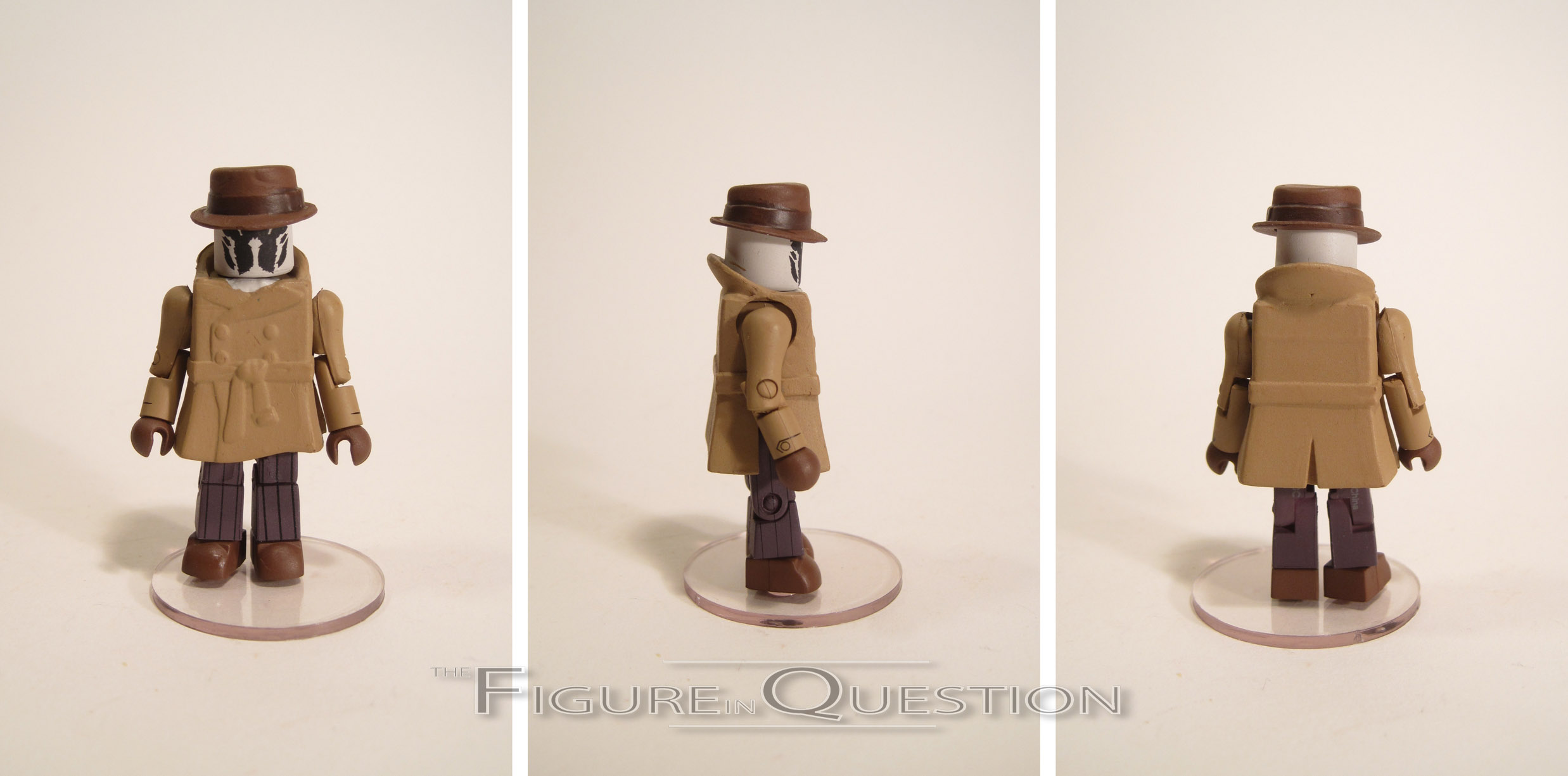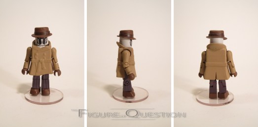 Rorschach is the closest the story gets to a main character, and is probably the most popular character contained there-in.  He was originally intended to be The Question, and is honestly the least changed character in that respect.  Rorschach’s design in the movie was completely unchanged from the comics, resulting in a ‘mate that can easily work for either version of the character.  The figure stands about 2 1/2 inches tall and has the usual 14 points of articulation.  He’s built on the basic body, with add-ons for his hat and coat.  Both pieces are new to this figure, and they work pretty well.  The coat’s a little on the bulky side, but it’s decent enough, and the hat’s one of the better takes on a fedora in this style.  Rorschach’s paint is about on par with the pair I looked at yesterday.  It’s pretty decent overall, but there’s some slight sloppiness on some of the base paint.  The detail lines are also minimal on this guy, so it’s a bit less of what DST’s good at, but what’s there is pretty solid.  Rorschach is packed with his grappling hook (a standard Rorschach accessory), as well as an unmasked head and hair, and a clear display stand.  The extra head is definitely cool, and my favorite extra.  The grapple is okay, but I can’t say I get why every Rorschach has it; I find it to be a rather minor piece.  I would have much rather had the aerosol can he uses to escape the cops, or his journal.  Also, the lack of extra heads with differing expressions is a little annoying.  Still, not a bad selection.