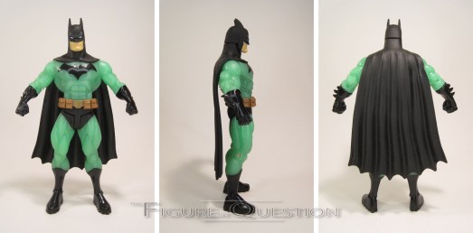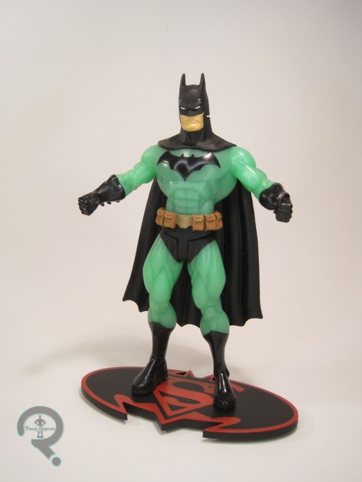 Kryptonite Batman was released in Series 4 of DC Direct’s Superman/Batman, which was a whole assortment based on “With A Vengeance.”  This was the main Batman-variant of the assortment, because you gotta have at least one.  The figure stands 6 1/4 inches tall and he has 11 points of articulation.  None of these style of figures were particularly amazing when it came to mobility, but the Batman figures were actually some of the worst, because his armoire permanently stuck out.  Seriously, dude looked like Randy from A Christmas Story.  This figure’s sculpt was actually a complete re-use from the basic Batman released in Series 1 of this same line.  Since he was just a palette swap in the comics, it’s not an unreasonable choice.  Like the two JLA: Classified Supermen I looked at a while back, this guy’s based on Ed McGuinness’s rather distinctive style.  In fact, he actually uses the same basic starting point as those two figures, albeit with a variety of more Batman-specific items.  Despite the difficulties with posability, the actual sculpt isn’t half bad, and does a pretty solid job of capturing McGuinness’s Batman in three dimensions.  Paint is the main thing that differentiates this figure from the Series 1 offering, but even on that front, he’s not that different.  He’s got most of the same basic detailing, but with glow in the dark green plastic instead of the grey for his body suit.  It certainly makes for a unique look.  The figure is packed only with a display stand, sporting the Superman/Batman logo.