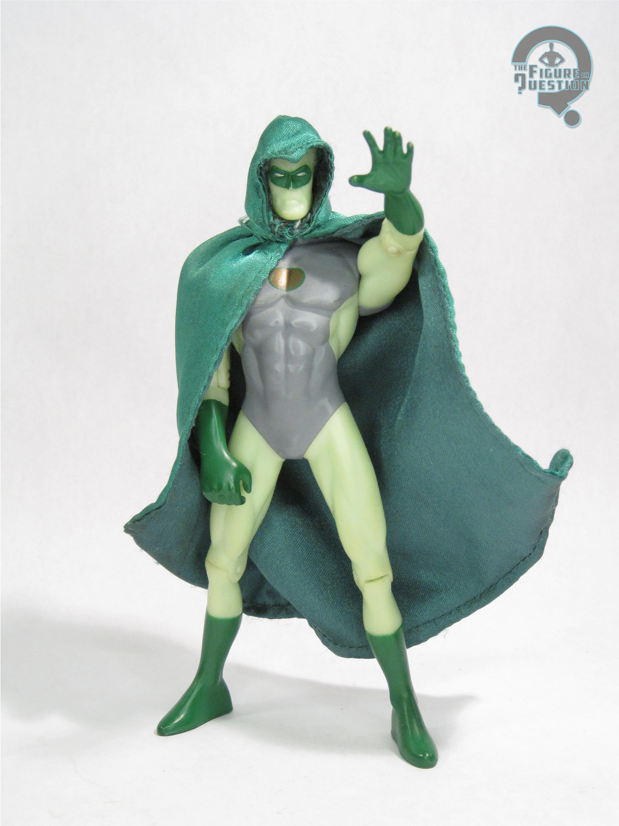 Green Lantern is part of Wave 16 of the post-relaunch Mego line, under the World’s Greatest Super Heroes 50th Anniversary banner.  He’s one of the eight retro throwback figures in the set, and one of the two that’s not a re-issue of a vintage Mego counterpart.  This GL is the Hal Jordan version, specifically sporting his classic ’70s appearance, making him through and through the correct look for a proper vintage Mego release, which is pretty cool.  The figure stands just shy of 8 inches tall and he has 26 points of articulation.  Hal is built on the brand-new Type-S Mego base body, which takes the vintage Type 2 body aesthetic, and reworks it to remove the band construction, as well as improve the general articulation set-up for the body.  It removes the issues of long-term viability of the band construction, creates a generally more solid feeling base body, and also gives him better posability…for the most part.  The only thing I’m not super crazy about is the knees, which are a bit more restricted on this body than earlier Mego base bodies.  Hal gets a unique head sculpt and hands as well.  They’re quite impressive pieces; the head sculpt in particular is really a star piece.  He’s the spitting image of the quintessential ’70s Hal, which is exactly what I want on this sort of figure.  The paint work on GL is on the head and both hands.  The head’s pretty clean, apart from just a touch of missing paint near the nose of the mask.  The hands are fully painted, with white for the gloves and everything, which gives them a slightly glossier finish, helping them match closer to the costume.  GL’s costume is made up of a jumpsuit and a pair of standard boots.  The jumpsuit is made up of separate cloth pieces stitched together, rather than just being silkscreened, which gives it a little more pop.  GL is packed with his power battery, which, unlike the 14 inch figure, he can actually hold.