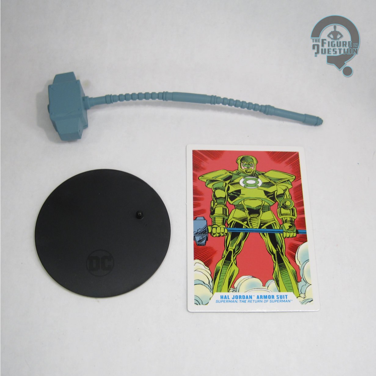 Hal Jordan in Armor Suit is a 2025 release for DC Multiverse.  He shipped alongside Eradicator and Western Batman.  He and Eradicator are both from the “Return of Superman” story.  Crazy that we got a white-streaks in his hair Hal and you’ll never know it.  Hal’s seen here in his armored up look from his fight with Mongul after the destruction of Coast City.  It’s a rather minor look, but also kind of a cool one, since it serves as something of a precursor to his eventual Parallax costume upgrade.  The figure stands just shy of 7 1/2 inches tall and he has 35 points of articulation.  This figure’s entire existence more or less relies on one thing: parts re-use.  As such, he is almost entirely re-used from the Steel figure released last year.  He gets a new head and a modified torso to sell it all. As with other instances of McFarlane doing this sort of re-use, it relies on half-stepping between both looks, and as a result neither is truly accurate to the source material.  In Hal’s case, that’s ultimately kind of forgivable.  The armor was a construct of his ring, and that allows a little more room for interpretation and imagination, I feel.  The new parts are pretty decent.  I like that the head keeps the same general facial structure as the Silver Age Hal from last year.  I also appreciate the decision to keep the helmet consistent with the body armor, rather than making it specifically comic accurate and risking it not really matching.  Hal’s color work is a lot of molded greens, of differing shades.  For the most part, they’re supposed to be different, but the elbows and knees notably don’t match the rest of the arms/legs around them, which looks a bit off.  The symbol on his chest is painted with a textured paint that made me think it was supposed to glow, but it appears it doesn’t.  He’s also got a tiny bit of painted shading on his lower torso and upper legs, which seems a little out of place.  It’s not awful, just strange that there’s not more of it, honestly.  Hal is packed with Steel’s hammer, a display stand, and a collector’s card.  The hammer’s a pretty essential part of the scene, so it’s good it’s here, though it’s really kind of floppy and prone to bending under its own weight.