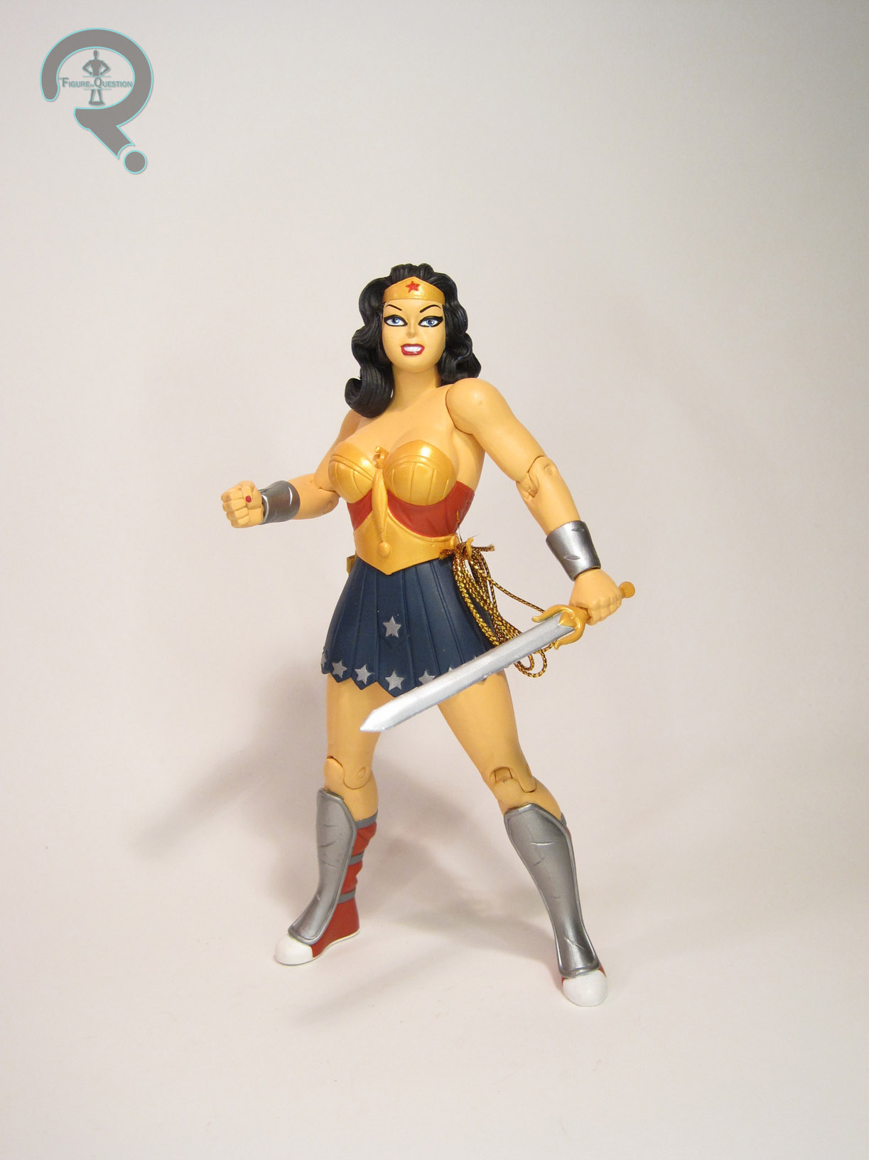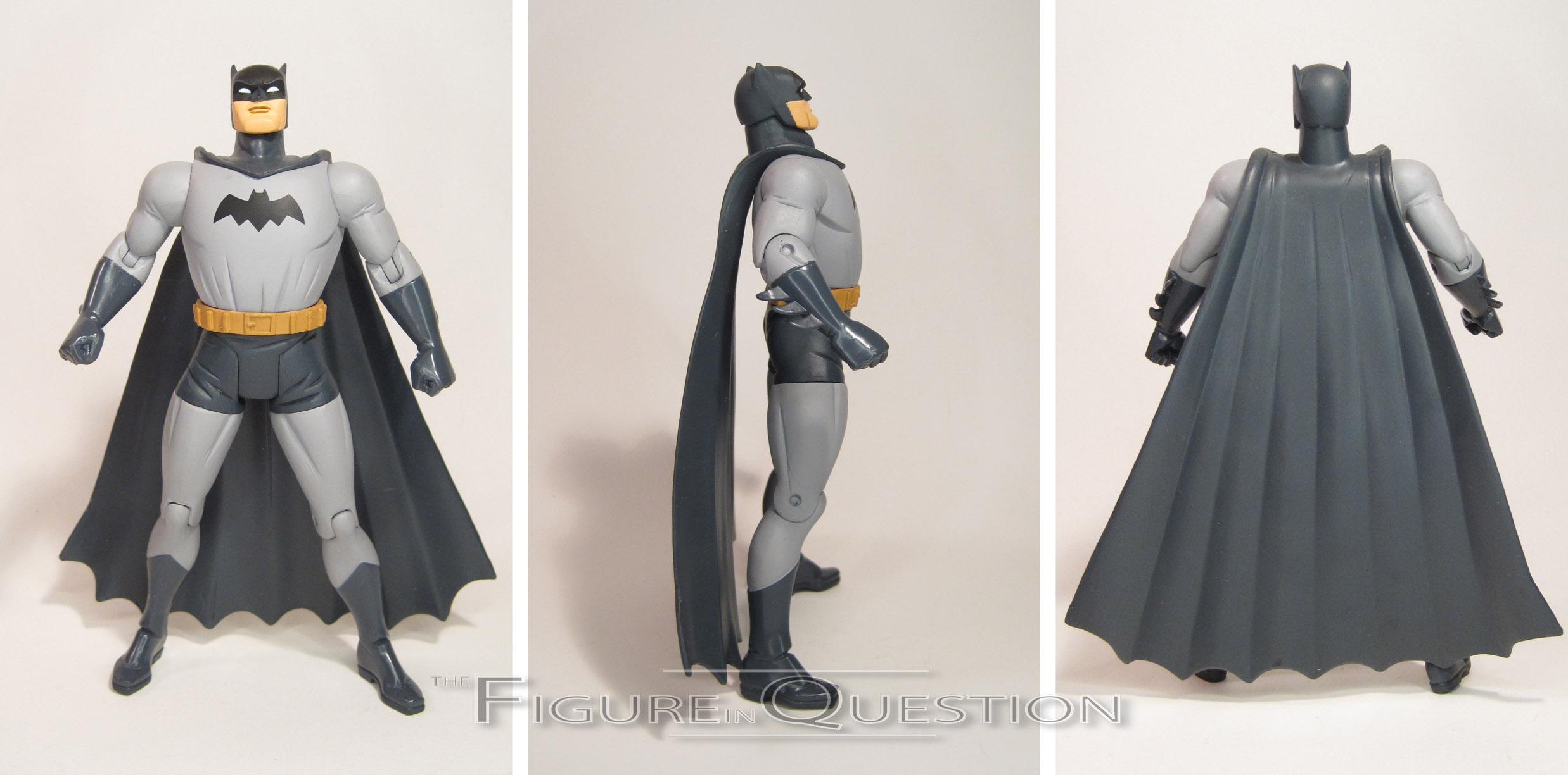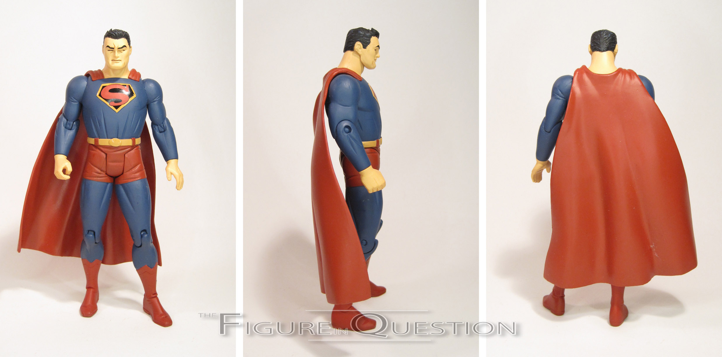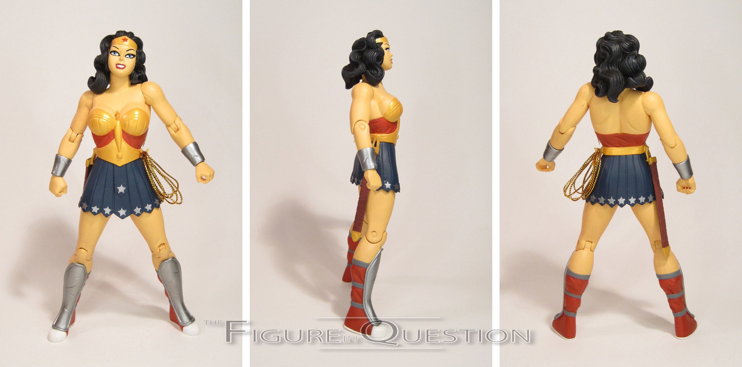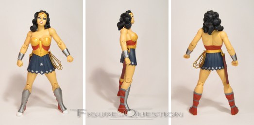 Darwyn Cooke’s Wonder Woman is my very favorite take on the character, especially in terms of design.  He very deftly merged her classic design with a more battle-ready amazonian look, creating a rather unique design for the character.  All of the important elements remained, of course, and it’s actually a pretty great send-up to the early Wonder Woman illustrations.  This figure marks this set’s first real deviation from the single releases, and it’s perhaps one of the first times that DC Direct ever directly addressed a problem with an initial release.  Wonder Woman gets a new head, which is a slightly more generalized expression, replacing the more intense (and not quite as well implemented) expression of the original figure.  I definitely prefer this one to the original release, though it’s a shame DCD didn’t give another stab at a more intense look.  The rest of the sculpt is straight from the original figure, and it’s actually pretty good.  Like Batman, Wonder Woman goes far more preposed than Superman, but unlike Batman, it doesn’t totally suck.  Quite the opposite, in fact.  The stance is very befitting the battle-happy Wonder Woman of the story.  The details of the sculpt are pretty fantastic, and I especially like the nicks and gashes taken out of her bracelets and shin guards.  Wonder Woman’s paint work is once again pretty decent.  It’s clean, and actually pretty bright, and slightly less subdued than the others in this set, which is appropriate for the character.  The original Wonder Woman release included an extra head, as well as a sword, lasso, and display stand.  This one doesn’t have the extra head, but does still get the sword and lasso, as well as the smaller display stand.