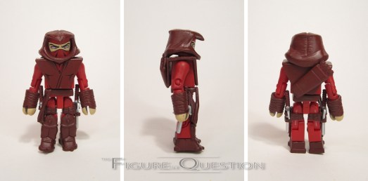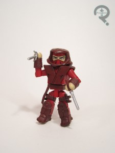 doing that more. Lady Bullseye gets a new head sculpt, which is a pretty nice piece. It matches well with her usual comics depiction, and manages to give her an expression that doesn’t look totally devoid of emotion, which is always a plus, especially for female characters. Her paint work does a pretty solid job of capturing her distinctive design, and doing it cleanly. Lady Bullseye is actually pretty well accessorized, with two sets of hands (in fists and gripping), a katanna, two sais, and two fans, as well as the torso piece for the Mindless One Build-A-Figure.