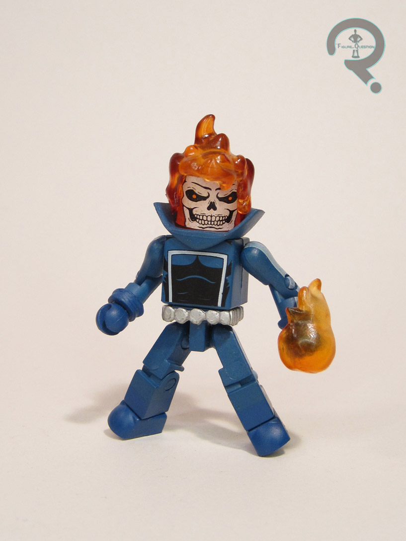 The fourth Ghost Rider, and technically the second Johnny Blaze, this figure marks the first, and to date only, ‘mate of the classic incarnation of the character. Ghost Rider makes use of sculpted add-ons for his hair, collar, glove cuffs, and belt. His hair and cuffs are re-used, with the hair coming from the Series 8 Human Torch, and the cuffs being the rolled-up sleeves from the Spirit two-pack. At first glance, the collar looks to be the same one from the DCD Star Sapphire, but it’s not quite the same. The belt is likewise a new piece for this set. The collar sits a little high on the torso, and hides his neck, which looks a little off. Otherwise, the parts make for a pretty solid recreation of Ghost Rider. Ghost Rider’s paint is a marked improvement on Angel. Perhaps it’s the variations of blue helping matters, but application seems to be cleaner and sharper than it was on Angel. The new head also does a tremendous job of handling GR’s flaming skull, doing it in a much more pleasing way than prior variants had handled it. Accessories are pretty much going to be the failing point of any Ghost Rider Minimate ever, since contractually he can’t have the Hellcycle that actually makes him a “rider.” As the classic version of the character, this one’s even lighter than other variations of the character, since he didn’t yet have the usual chain whip. This one instead just gets a flame effect piece, which is certainly better than nothing.