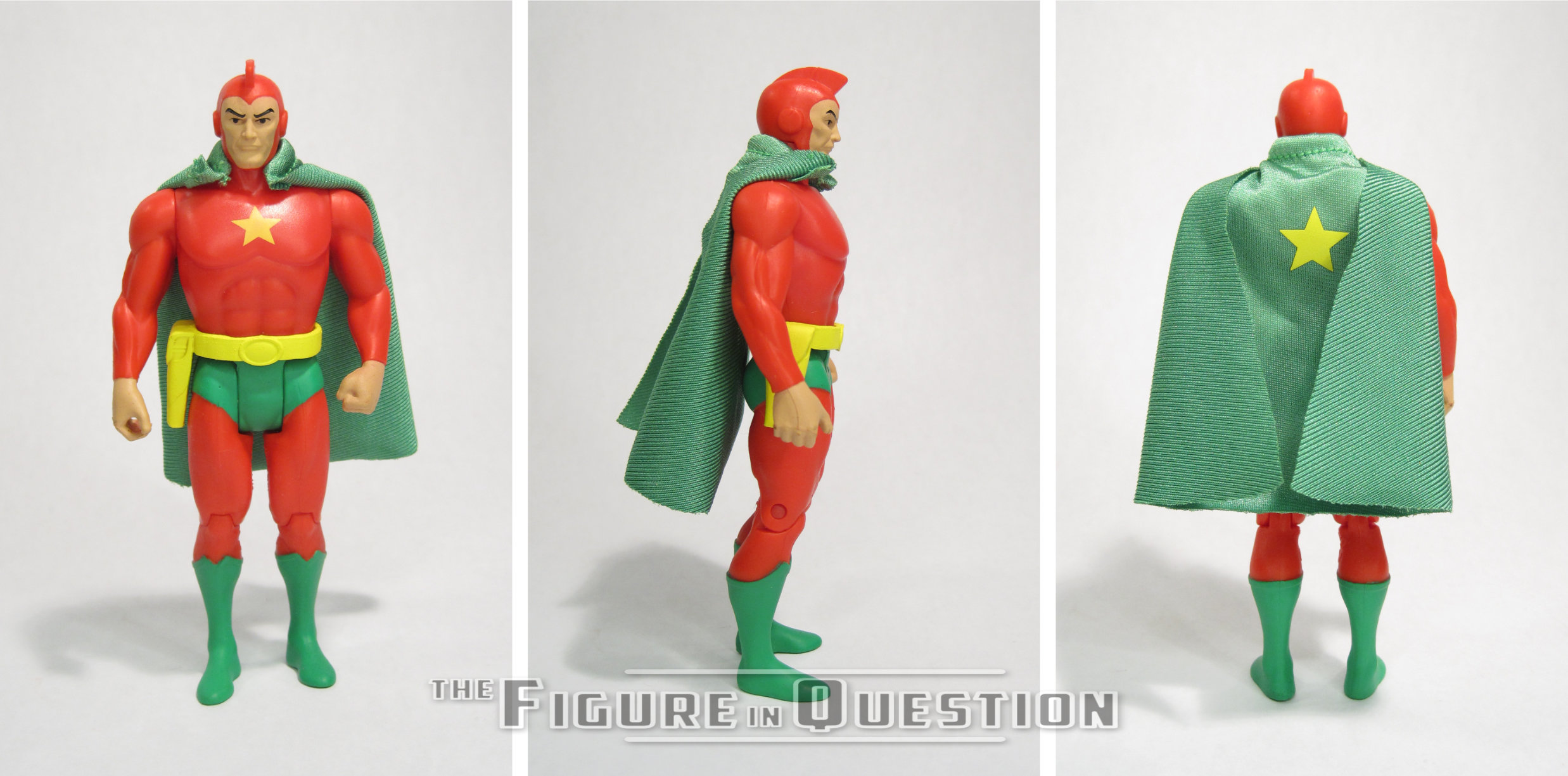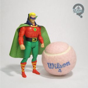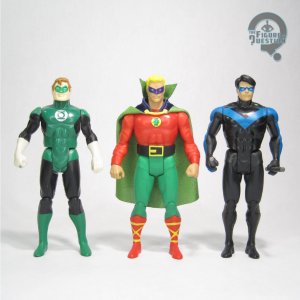 justiceguild3Powerless against anything aluminum, the Green Guardsman used his power ring to protect Seaboard City as a member of the Justice Guild.  A young John Stewart, who would grow up to become Green Lantern, read comic books of his adventures!” That’s a better bio, I suppose, but the bit about John seems really tacked on.  John doesn’t really interact with Green Guardsman at all.  So, in case it wasn’t obvious, Green Guardsman takes the place of Alan Scott, the Golden Age Green Lantern.  Like the other male figures in the set, Guardsman is built on the medium male body, with a unique head and an add-on piece for the cape.  The head’s okay, but probably the weakest of those included in the set.  It’s looks a little smooshed at the front.  The cape would actually go on to be shared with Alan Scott himself later on the line.  It’s a decent enough piece, but it makes him really difficult to keep standing.  The paintwork on Green Guardsman is about on par with the rest of the set.  It’s bright and bold, and the lifework is all pretty clean.  The only real nit is that the ring gets kind of lost on the hand.  Maybe an outline or something would have made it stand out?  Guardsman includes no accessories.  While that’s somewhat more forgivable with the others, this guy would have really benefited from some constructs or something.