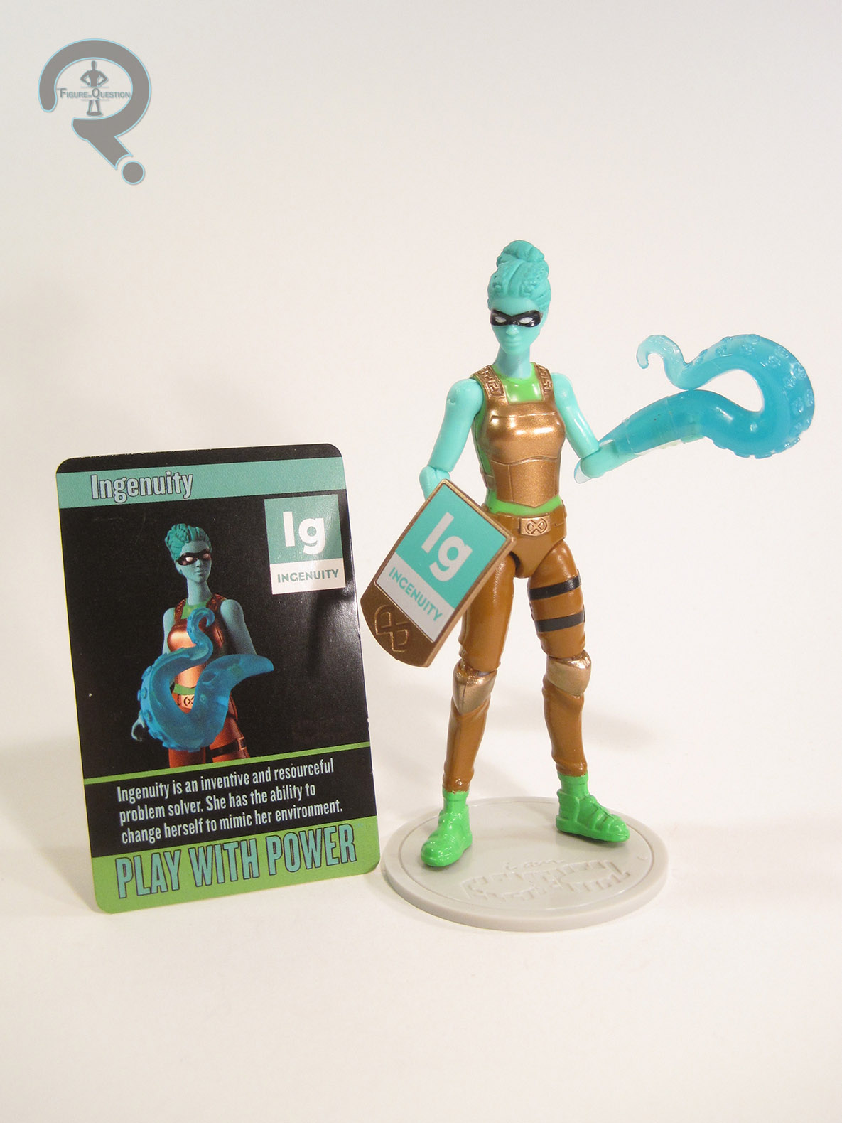 “Ingenuity is an inventive and resourceful problem solver. She has the ability to change herself to mimic her environment.” Ingenuity almost feels like this set’s counterpart to Industry’s quirky tech person, albeit with a more “environmental” twist. She’s got less of a heroic thing going on, and more of an explorer thing. She trades in the more expansive boots of the last two figures for a more sensible pair of hiking boots (shared with Exploration), and has a rather humble pair of small wristbands (shared with Oblivion). I definitely get an aquatic vibe from her. Her color scheme is very aquatic (lots of blue-greens), and she includes a little octopus-tentacle construct, and even the dreads in her hair sort of match the tentacle thematically. Maybe she mimics aquatic environments?