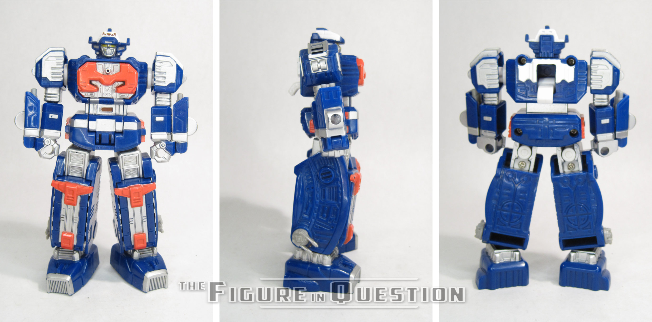 The Astro Megazord was released as part of the first “Action Zords” assortment of Bandai’s Power Rangers in Space tie-in line in the Spring of 1997. The Action Zords were smaller scale Zords sold in the same blister style packaging as the standard release figures, as a sort of competitor to Micro Machines’ Action Fleet range. There were two versions of the Astro Megazord, one in robot configuration, the other in ship mode, and the Mega Tank. This figure here is the robot Astro Megazord, in case you couldn’t tell. The figure stands about 5 inches tall and has 9 points of articulation. The articulation is rather on the restricted side. The neck, shoulders, and elbows are all just cut joints, while the hips and ankles are rather simple ball-joints. None of it has much range, but then again, neither did the show design. The biggest hang-up, really, is the lack of hinges on the elbows. Also, for
