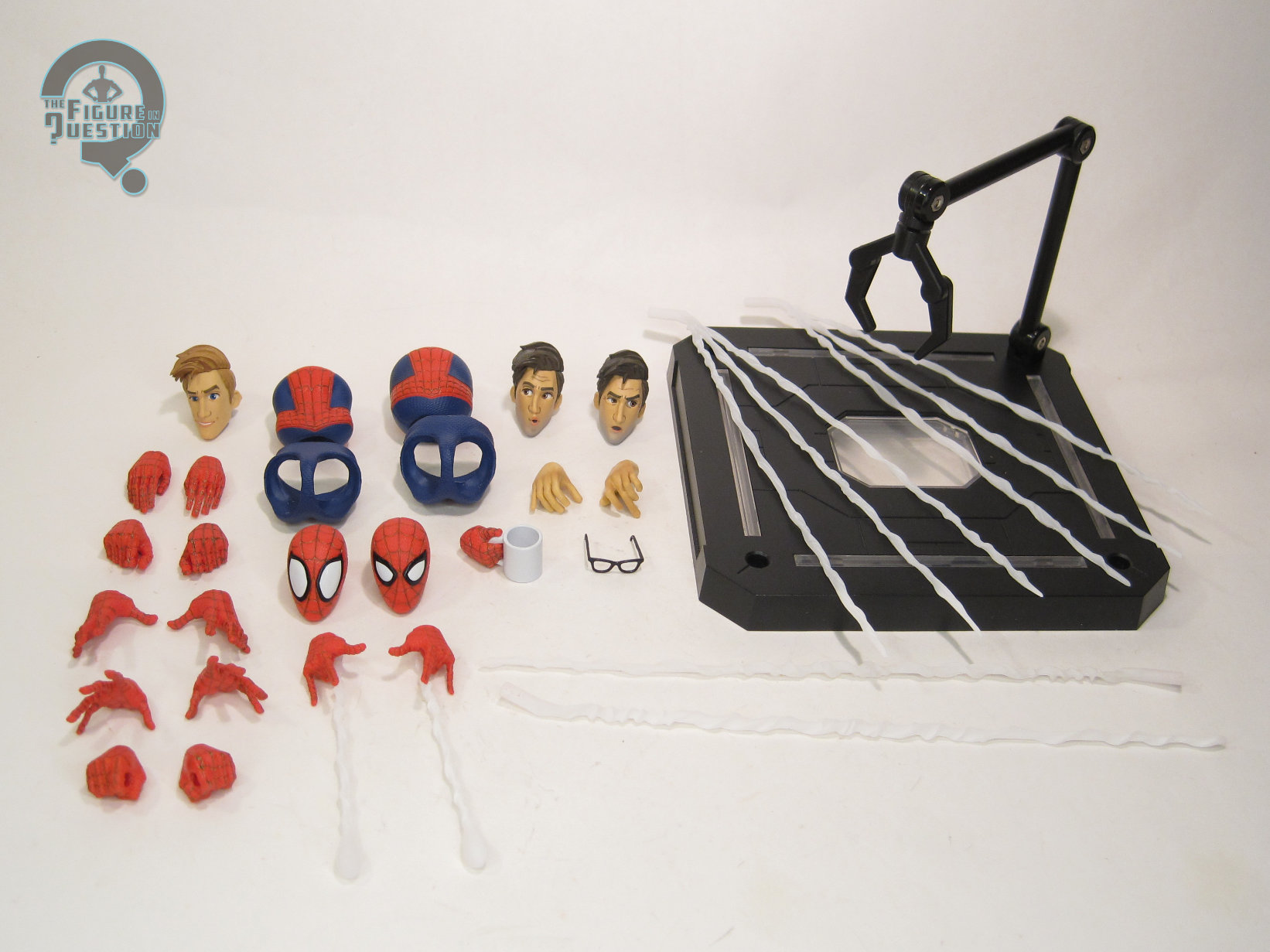 a little sticky, and it would have been cool to get some butterfly shoulders, but generally it’s a nice step up. The actual sculpting is as top-notch as the Spider-Verse figures have been the whole time. Generally, he’s pretty sharp, and they’ve given him those nice, defined abdominal muscles to show that he’s not Peter B. Paint here is generally pretty basic stuff. Largely, he’s using molded colors, of course, but there’s the blue/red overlaps, which are overall okay. There’s some slop on the mid-section of my figure, but it’s minor. The head gets some more in depth work, with a printed face, and some accenting on the hair. Peter is packed with a masked head (the same as the one from last year) and two sets of hands in fists and thwipping poses. It covers the basics, but does feel a little light. Maybe another head with a damaged mask, like his final scene showed, would have been cool.