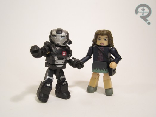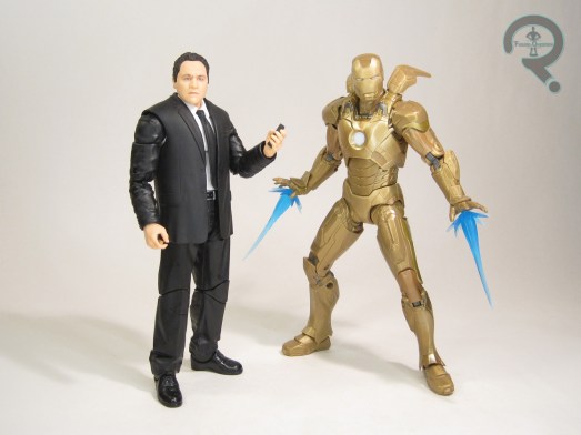the application is all very clean. In particular, the markings and writing on the armor are a really good touch, and they’re very sharply defined. Iron Patriot is packed with six different pairs of hands (fists, two different styles of open gesture with spots for blast effects, and the same two styles without the spots for the blasts), a saluting hand for his right side, his shoulder cannon (which is articulated itself), two different styles of forearm plates (closed up and with the rockets out), four different blast effects, and a display stand. He also has a light-up feature in both the head and torso. The eyes are kind of dim on my figure, but the arc reactor is nice and bright.