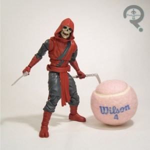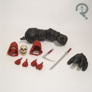 application of paint to also be sharper on this guy, especially on what we can see of the face. The only thing that slightly annoys me here is the red being ever so slightly different from King Daredevil’s shade. Why does that annoy me? I’ll get to that in a moment, when I discuss the other notable change-up from the Hand Ninja: the accessories. He gets the same sword, as well as one of the two kama from the Hand Ninja, but they’re joined by two sets of hands (in fists and gripping, with the gripping being shared with DD), and an alternate skull head with its own removable hood. Now, here’s the thing: I’m glad this guy gets the two sets of hands, and it’s cool that the gripping ones are even shared with King DD. The trouble is that with the shades of red being slightly different between the two, you can’t also use the fists for King DD, which is kind of a bummer. Ultimately, it’s not really this figure’s fault, though. In addition to all of his own parts, he also includes the left arm and an extra hand for the Mindless One.