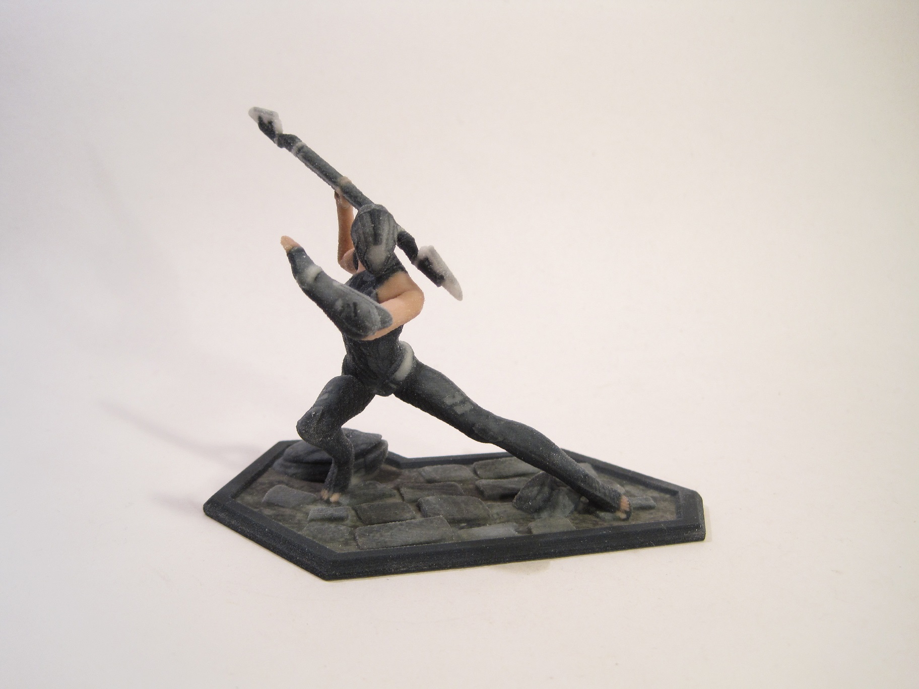 Boring stuff out of the way first. This figure is based on Isa from Infinity Blade 3 dressed up in the Dark Stripe armor, Crystalis helm, Lunith Brace gauntlet, and wielding Norfair. She has no articulation as usual and is in the Horizon pose which actually makes her much shorter than the other figures at only two and a quarter (three including the weapon) inches tall. Now onto the fun part. The first thing I noticed when I opened this figure is that her weapon, Norfair, is too chunky in comparison to the game and not by a small margin. It ends up looking like a pool noodle rather than the sleek, streamlined staff it’s supposed to be. That being said, I can understand why it came out that way because as it is it seems very fragile. Were it any thinner I wouldn’t be surprised if it fell off if someone happened to sneeze a little too hard. But that’s not even the worst of it. In contrast to the other figures in this set, the aforementioned Horizon pose is much more of an action pose. This is where the problems arise, not from the sculpt which is spot on, but from the character model in the game. When you’re playing the game, the characters are moving around doing all sorts of cool moves, but it happens quickly and from very fixed camera angles so you don’t really see everything going on. As she is now, Isa’s spine seems impossibly contorted, her arms look like they’re made out of Play-Doh, and her legs around the hip have these really terrible creases from the 3D mesh folding on itself. I had to go back into the game to look, and sure enough, all these issues were there from the start. The color details are closer to what we’ve seen on the other figures, maybe actually a little brighter than the others but still marred by the lack of varnish. There’s some nice line work on the torso, head and legs, but the arms. She’s supposed to have a few touches of dirt on her arms as one might after a long day of fighting monsters, but they missed the mark and instead made her look like she’s got some nasty bruises. Isa comes with no accessories.