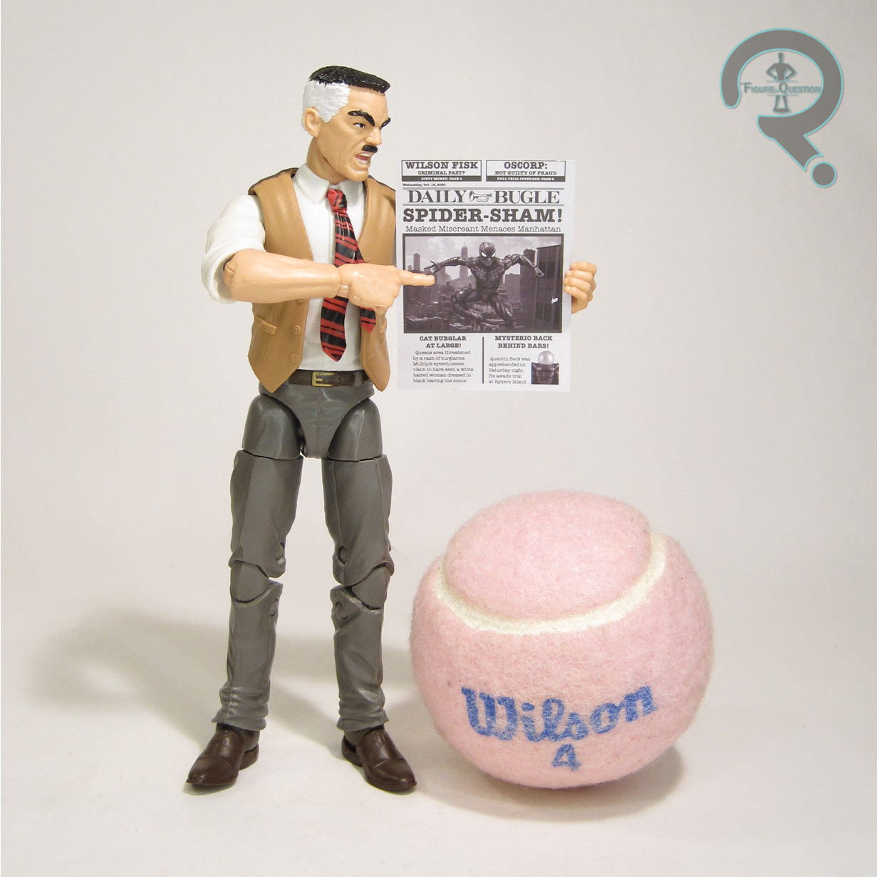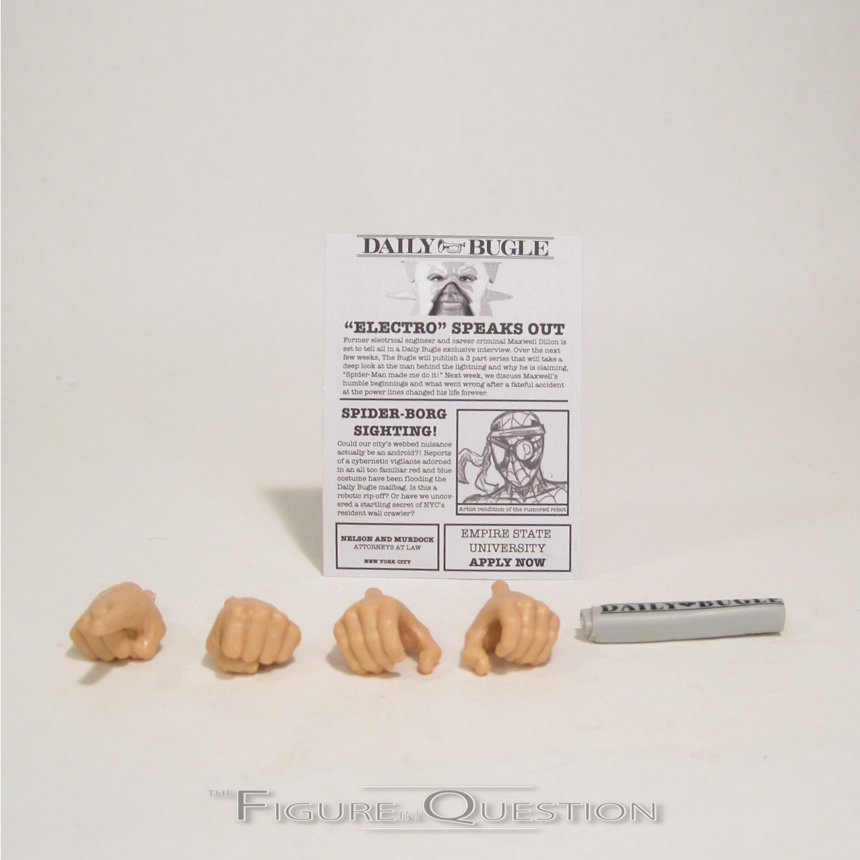 particular is really sharp, and really expressive. In general, the faces in this assortment were really strong, and JJ is a great example. One rather minor touch I quite like as well is the two-toned nature of his vest, which is blue at the front and black at the back, showing that the two sections are actually made of two different fabrics. JJ includes a nice selection of extras. He has a second set of arms, in blue to match the legs, as well as a corresponding suit jacket/tie/vest piece, allowing for a slightly more formal appearance for the character. He also has two copies of the Daily Bugle; one rolled up and one folded flat. The flat one gives us a couple of news stories, including a shot of Spider-Man and of Tony Stark (who is inexplicably the RDJ version). This offers a ton of variety for the figure, and makes him quite versatile.