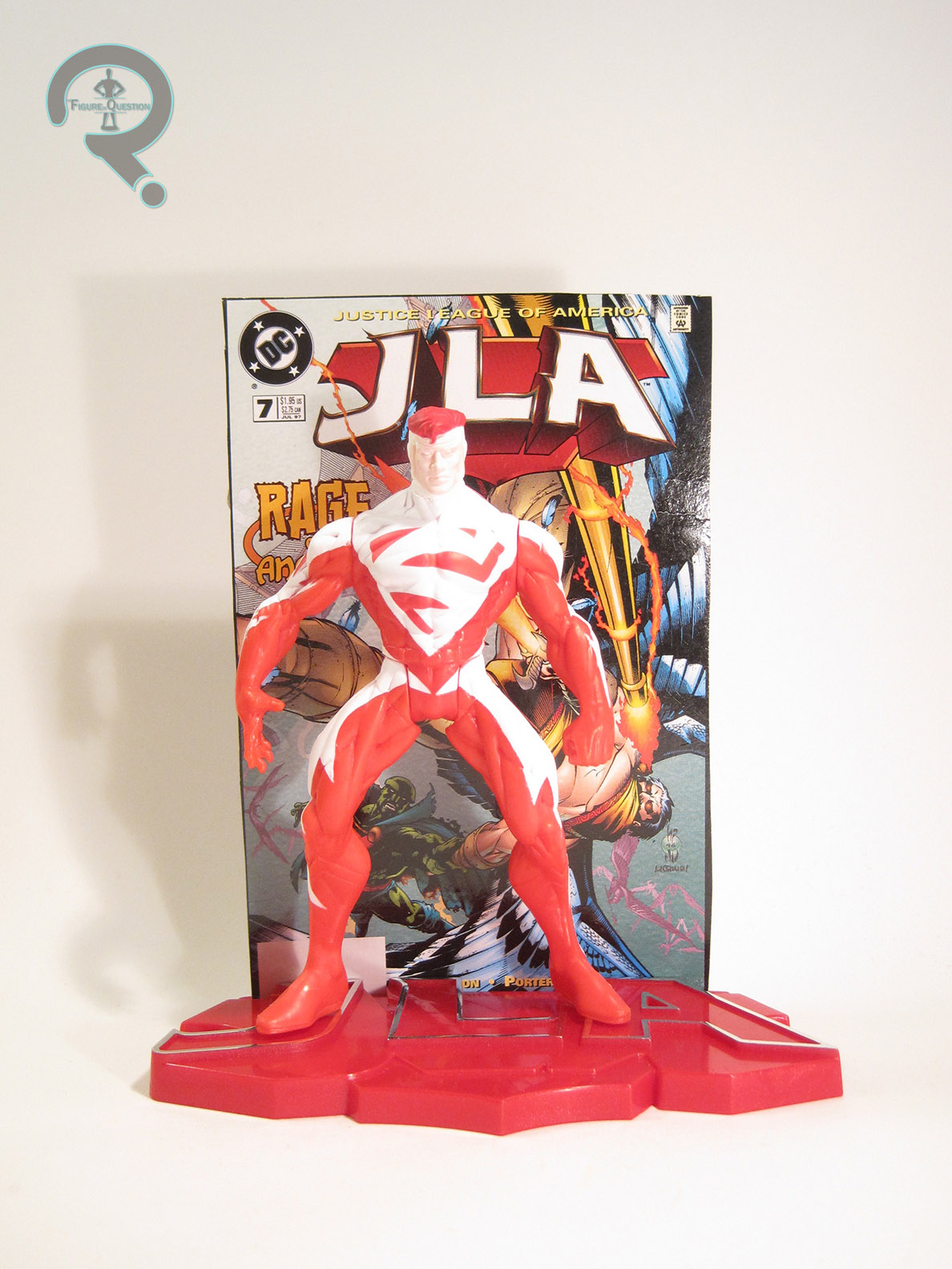 supermanredjla2Both Superman Blue and Red were released in the first series of single-carded JLA figures.  However, while Blue was also available in the first boxed set of figures, Red was exclusive to the singles (and is the only figure from Series 1 to be so).  The figure stands about 5 inches tall and has the standard 5 points of articulation for the time.  JLA was largely a way for Kenner to reuse their old Total Justice molds another time (though later assortments would steadily add more and more unique pieces to get a few more characters not released in Total Justice), so it’s not really a surprise that Superman Red was a total re-use.  That being said, he was certainly a more uneventful re-use than some of the other figures.  Most of the first series were just simple repaints of their TJ counterparts, but since Superman’s design had changed more than a little, they had to Frankenstein him a bit to get as close as possible.  He (along with Superman Blue and the evil Hardlight Superman from the second boxed set) uses the torso, arms, and legs of the Total Justice Superman, with the head from Man of Steel’s Hunter Prey Superman (the one packed with Doomsday).  The result is close enough…if you squint.  The body still has the belt, shorts, and boots of the original figure, just painted over as if they aren’t there, which is certainly odd, but not too horribly distracting.  What is distracting is the head’s painting over the clearly defined edges of the head gear, giving him these obvious lines running down his cheeks and across his forehead. Sure, the paint application’s clean for what it is, but what it is is a flagrant disregarding of the actual sculpted material.  On the plus side, he’s a nice, bright red, which means he really pops on the shelf.  So, that sorta makes up for it, right?  JLA figures were usually pretty light on the accessories, but Superman, like the rest of them, includes a display stand.  It’s even in red.   There’s also a cover on the back of his box which can be cut out and placed on the back of his stand.  It’s JLA #7, which is kind of an odd choice, since not only is Superman Red not on the cover, he’s not in the issue.
