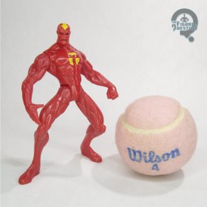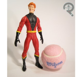 The Atom was released in Series 4 of Hasbro’s JLA line.  He, alongside Red Tornado and Wonder Woman, represented the “new” for the assortment, a fitting send-off for the line, filling in some of the classic roster.  Atom is pretty much as classic as the line got, in fact, because he was just in his original costume, rather than an updated equivalent like most of the line.  The figure stands just under 5 inches tall and he has 5 points of articulation.  As with a lot of these figures, Atom was banking on a lot of parts re-use.  Curiously, his parts weren’t re-used from JLA or its predecessor Total Justice.  Rather, his body from the neck down is the Batman & Robin line’s Dick Grayson figure.  It gives Atom the distinction of being hands down the least pre-posed figure in the whole line, by virtue of his very basic standing pose.  It’s honestly not a bad bit of re-use, though, with its generally basic layout of design elements and the nice raised gloves sculpt.  He gets a new head sculpt, which is pretty respectable, and fits well with the re-used parts.  I like the sculpted insignia in the forehead quite a bit.  The figure’s paint work is generally not bad.  Unlike others in the line, he doesn’t have to ignore any sculpted costume elements, or anything like that, and the colors are generally a good match for how he was being colored in the comics at the time.  Mine’s got a spot of wear on his nose, but that’s hardly the fault of the figure.  Atom was packed with a JLA display stand in bright red, as well as a miniature version of himself, which I unfortunately lost a good many years ago.