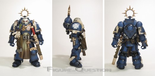 little sleeker than the traditional Space Marine helmet; the mouth plate is now smooth and without the notable rebreathers. He also gets a slightly more involved back pack, a tabard, and a handful of different items hanging off his belt, to say nothing of his various ribbons, which I assume have to do with his service achievements. It all makes for a look that’s very involved, but thankfully not busy. Like the design, the sculpt certainly has a lot going on; there’s many layers and ornate fixtures to the design, mimicking the very detailed nature of the game miniatures quite well, while also adapting him to a larger scale. The details are quite sharply handled, and there’s a depth to them that wasn’t quite there on the McFarlane offerings. The more ornate parts of the armor are definitely sharper, that’s for sure. While the McFarlane figures kept their paint work rather on the more basic side (a side effect of the lower price point on the figures),