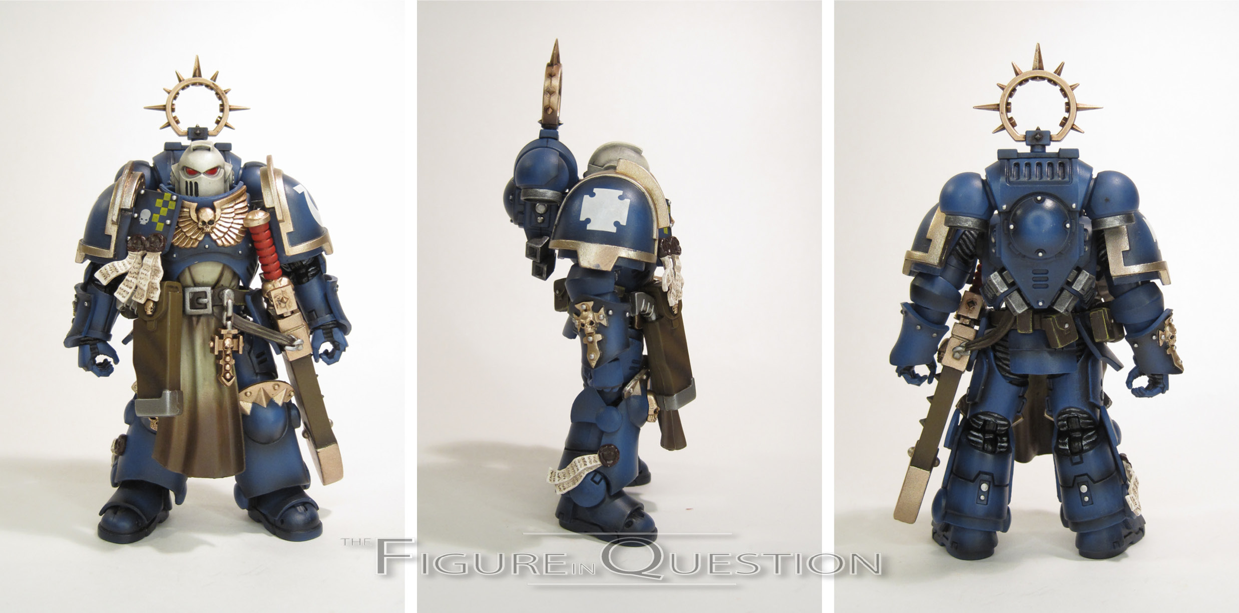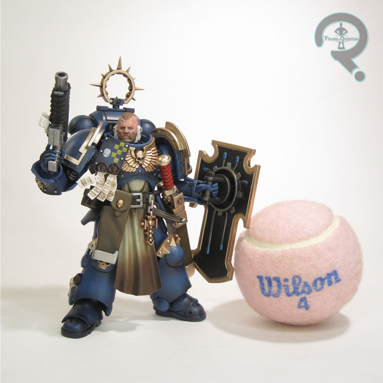 The Ultramarines Blade Guard Veteran 02 is part of Joytoy’s overall Warhammer 40,000 toyline. He’s a slightly more deluxe scale release for the line, similar to how the “Steel Legion” figures are treated for the Battle for the Stars toyline. As his numbering suggests, he’s the second Blade Guard Veteran for the Ultramarines, though it’s worth noting that the first one initially appeared to be Sergeant Proximo, who was not actually numbered. But then there was also a totally unnumbered one that got solicited more recently. So maybe he’s the first one, just retroactively? There’s also an 03, who is, you know, numbered. But this guy’s the 02, and he’s the one I’m looking at! The figure stands 4 1/2 inches tall and he has 33 points of articulation, as well as moving shoulder pads, as well as jet-ports on his back pack. His articulation sports quite an impressive range, especially given his bulky build; it’s better implemented than the McFarlane equivalents, and even those were pretty good for the designs. In terms of sculpting, this guy’s a little different than the prior Joytoy figures I’ve taken a look at. Rather than an underlying sculpt with armored parts on top of it, the armored pieces are just sculpted straight on. For a design this bulked up, it makes a lot of sense, and it means that he’s quite sturdy. The Blade Guard Veterans get a helmet that’s a