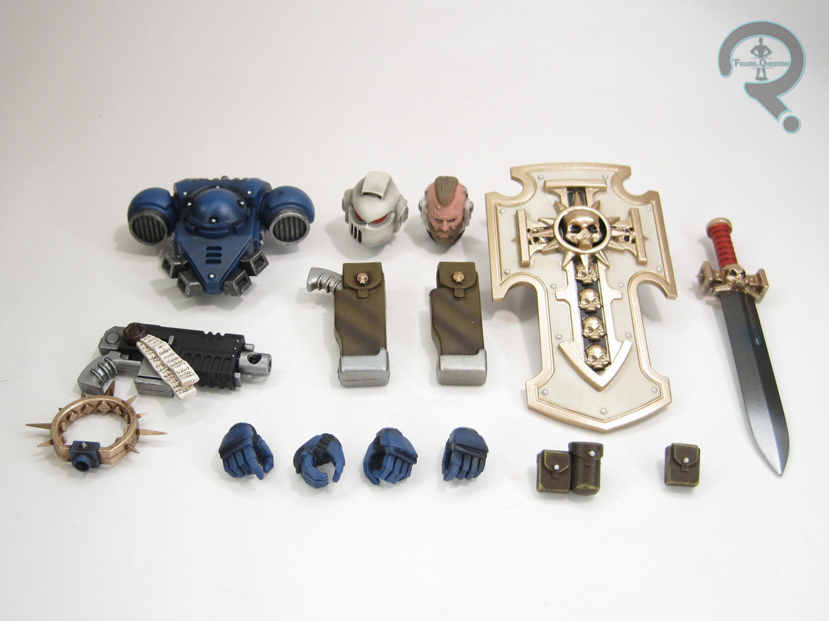 little sleeker than the traditional Space Marine helmet; the mouth plate is now smooth and without the notable rebreathers. He also gets a slightly more involved back pack, a tabard, and a handful of different items hanging off his belt, to say nothing of his various ribbons, which I assume have to do with his service achievements. It all makes for a look that’s very involved, but thankfully not busy. Like the design, the sculpt certainly has a lot going on; there’s many layers and ornate fixtures to the design, mimicking the very detailed nature of the game miniatures quite well, while also adapting him to a larger scale. The details are quite sharply handled, and there’s a depth to them that wasn’t quite there on the McFarlane offerings. The more ornate parts of the armor are definitely sharper, that’s for sure. While the McFarlane figures kept their paint work rather on the more basic side (a side effect of the lower price point on the figures),