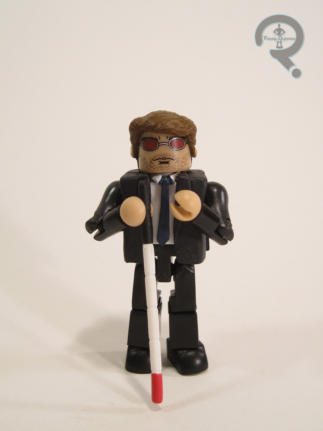 on-screen design, and the costume translates to Minimate form exceptionally well. While the paintwork is mostly just flat back, he does have a fully detailed torso, with subtle highlighting to show off his musculature, as well as the tiny bit of red piping on the shoulders. Under the mask, there’s also a fully detailed Matt Murdock face, with a pretty solid likeness of Charlie Cox. For his base look, DD includes his wooden eskrima sticks, given to him by…Stick, as well as the usual clear display stand. He also includes a spare head, hair, torso, tie, suit jacket, hands, and walking stick, allowing you to turn him into a civilian version of Matt. Supply your own arms and legs, and you’ve got yourself a whole second figure!