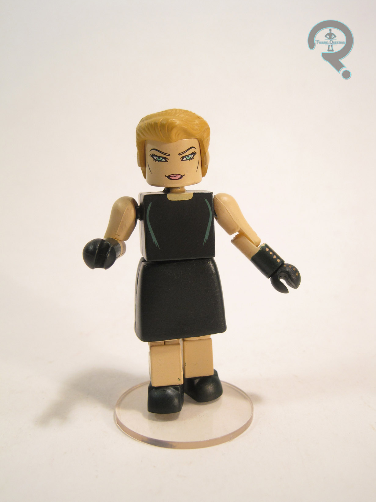 Yukio is a relatively minor X-Men character, but she plays an important role in the Wolverine mini-series that the movie based its plot on, so she found herself with a decently sized role. In the comics, she was just a normal human with ninja training, but the film made her a mutant with the ability to foresee death. She had two rather distinct looks in the movie (neither of which really resembled her comics appearance). This figure represents the less formal look that Yukio sports towards the end of the movie. She stands about 2 ½ inches tall and has 14 points of articulation. Yukio has add-on pieces for her hair, skirt, and the tops of her boots. All of these are re-used, with the hair coming from the TRU Series 9 Magik, the boots coming from Series 34’s 90s Rogue, and the skirt coming from BSG’s President Roslin. The parts are all fairly decent matches for her look from the film, so the re-use is reasonable here, though the boots have the unintended side effect of making her taller than everyone else in the series. The paintwork on Yukio is decent. She’s got a lot of color, and she’s pretty bold looking, which is nice. The detailing on the torso is nice and sharp. The face doesn’t really look like Rila Fukushima; for some reason, they’ve given her a slight smile, which doesn’t seem right for the character. That said, the face is nice and sharp, and looks suitably unique. Yukio includes a clear display stand and…nothing else. Not even a sword. That’s quite a letdown, especially since Yukio is pretty much never seen without her sword in the film.