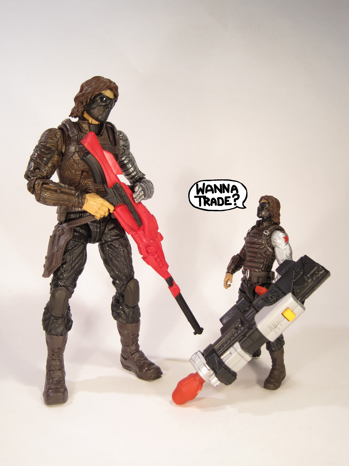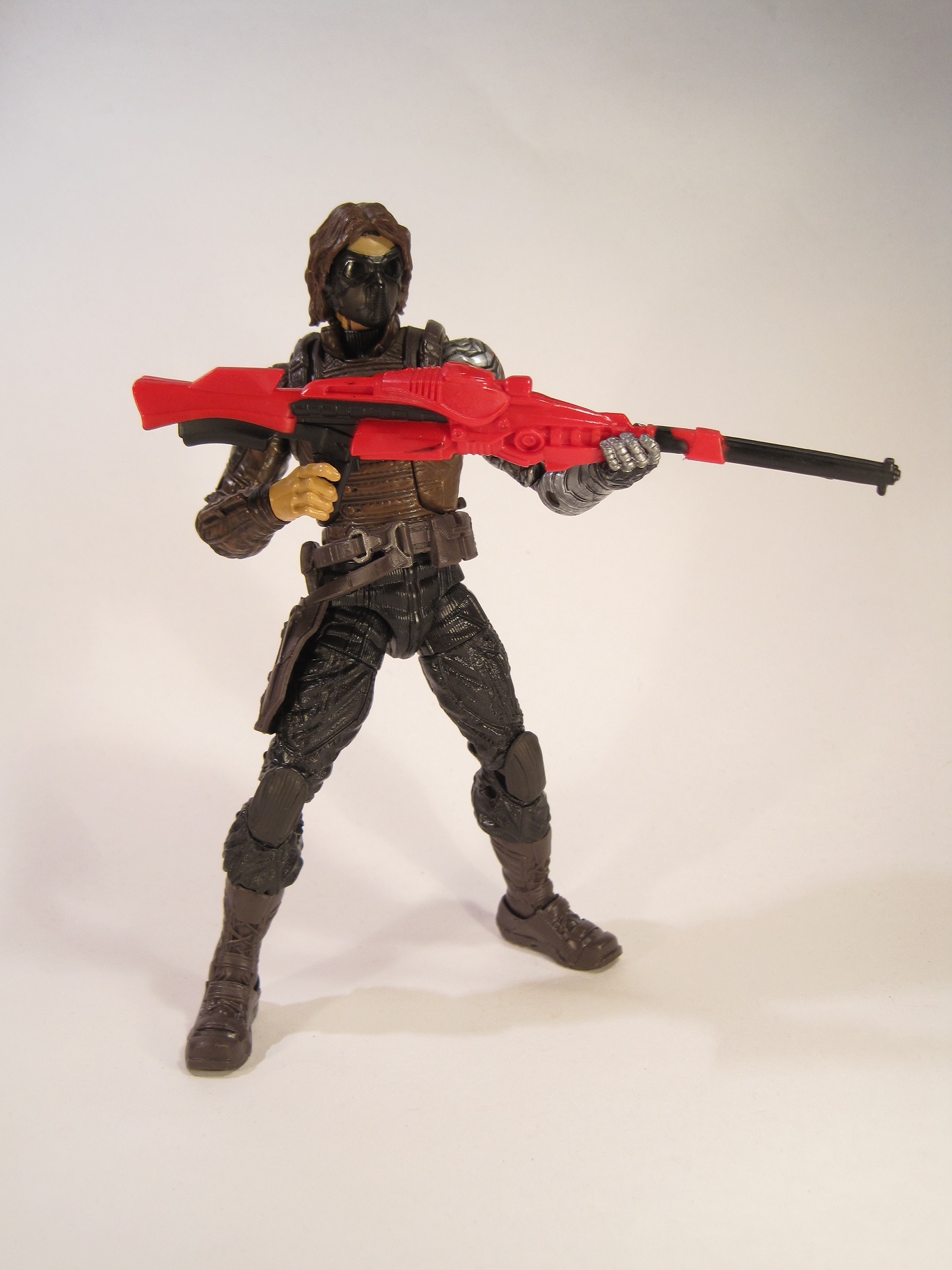The A.I.M. Soldier was released in the first series of the Captain America: The Winter Solider Marvel Legends Infinite Series. The official title is “Soldiers of A.I.M.” which he shared with Baron Zemo (who I reviewed back when he was new). It certainly fits him better than it did Zemo. The figure stands about 6 1/2 inches tall and he has 29 points of articulation. At the time of his release, the A.I.M. Soldier was an all-new sculpt, but most of the body was re-used for last year’s Ghost Rider. He has a different head, obviously, depicting the signature “beekeeper’s mask,” as well as different forearms, and a unique belt. The overall appearance is that of the classic A.I.M. design. There are some slight discrepancies on the front of the chest and the specifics of the gloves, due to this body being preemptively designed to work for the comic version of Star-Lord released just a few months after this figure. The discrepancies aren’t anything incredibly distracting, and there have been enough slight variations to the A.I.M. design that it doesn’t immediately jump out as being “wrong.” Plus, it’s just an A.I.M. Soldier. How important is it for them to be spot on? The figure also gets an add-on piece for his bandolier, which gives him some nice extra details (and also covers up some of those inaccuracies on the torso). In terms of paint, the A.I.M. Soldier is decent enough. He manages use lots of yellow without looking totally ridiculous (he’s still ridiculous, but not totally ridiculous), and most of the application is pretty clean. There’s a slight matching issue with the yellow at the bottom of the belt piece, but that’s really it. The A.I.M. Soldier included two blasters, one large and one small, as well as right arm of the Mandroid (the same piece included with Zemo).
