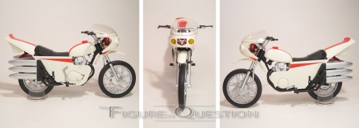 He can’t very well be “Kamen Rider” without a bike to ride, now can he? Of course not. Previously, Figuarts Kamen Riders and bikes were sold individually, but not this time, and that’s definitely a good thing for me. The Cyclone measures about 5 1/2 inches long by about 4 inches tall. It’s got actual moving wheels, and even a working kickstand, which I always count as a plus, and is generally just constructed like an actual bike. That means it looks really, really good. Just fantastically sharp construction and everything. Hands down my favorite part of the whole thing is the back wheel, which is actually on shocks, with working pistons and everything. That’s an insane attentiveness to detail, that by no means needed to be there, but by god they wanted it to be accurate, so there it is. The average consumer won’t likely even notice it, but I will, so it matters to me. The bike comes with two different attachment pieces to keep it standing, One is pretty basic; it just hooks over the back wheel and keeps it standing, which is decent enough. The more exciting piece is the one that requires some extra gear not included in this set There’s a port that plugs into the base of the bike, allowing you to connect one of the standard Figuarts display stands to it. It’s a pretty awesome option, and allows for some kick-ass set-ups. It’s a shame no stand was included in the set, but it’s not like there aren’t already a ton of extras included here.