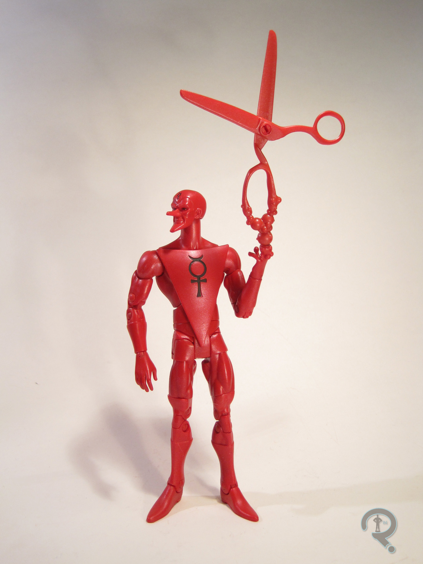 Mercury was released as part of the 16th Series of DC Universe Classics. He was the third member of the Metal Men to be released, and the last member to be released at retail. Way to go Mercury, you ruined it for everybody. The figure is 6 ¼ inches tall and has 29 points of articulation. Mercury was another figure built on the skinny buck. I know that the first “skinny” character was Deadman in Series 11, but I think 16 was the first series to use this slightly improved iteration of the body. While he uses the base as a starting point, Mercury actually has a fair number of non-standard parts. The best piece if the figure is definitely the head, which does a fantastic job of capturing the character. His expression is just perfect for Mercury, and they’ve really nailed the exaggerated proportions. The extended nose is a separate piece from the face, so there’s a noticeable seam if you look closely, but from a normal viewing distance, it’s unnoticeable. The rest of the body works pretty well for Mercury; a lot of the wackier proportions that looked out of place on other characters look perfect here. Mercury’s paintwork is somewhat deceptive. The previous two Metal Men were just straight metallic colors, so when I first saw Mercury, I was disappointed that he was just a flat red. But, after taking him out of the package, I realized the red was actually pearlescent, which is actually really impressive looking, and gives him a nice unique feel. Mercury included an extra hand made to look like it’s morphing into a giant pair of scissors, which is a pretty awesome way of showcasing his powers (they’re even articulated!). He also included the torso of Bane, the Collect-N-Connect for Series 16.
