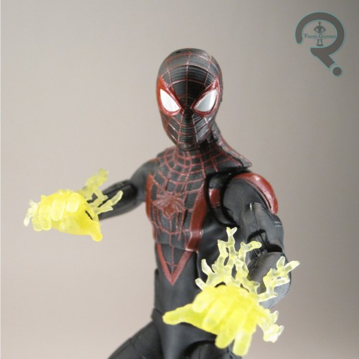 slick, but there’s also some subtle dark blue work. It’s easy to miss, but it adds a little extra pop to the figure’s visual. Miles is packed with an extra unmasked head and two sets of hands (thwipping and fists). The last unmasked head didn’t *quite* land the film design, especially the hair, but this one really gets it down. Also, they don’t have the weird ball joint for each head, so that’s a plus. Of course, it’s still a smaller socket size than the standard, so swapping isn’t going to really be a thing, but it’s progress. As with the last Miles, I do wish we’d gotten another set of hands with open gesture, but I’ll just have to continue to be disappointed with every Spider-Man that cuts those, I guess.