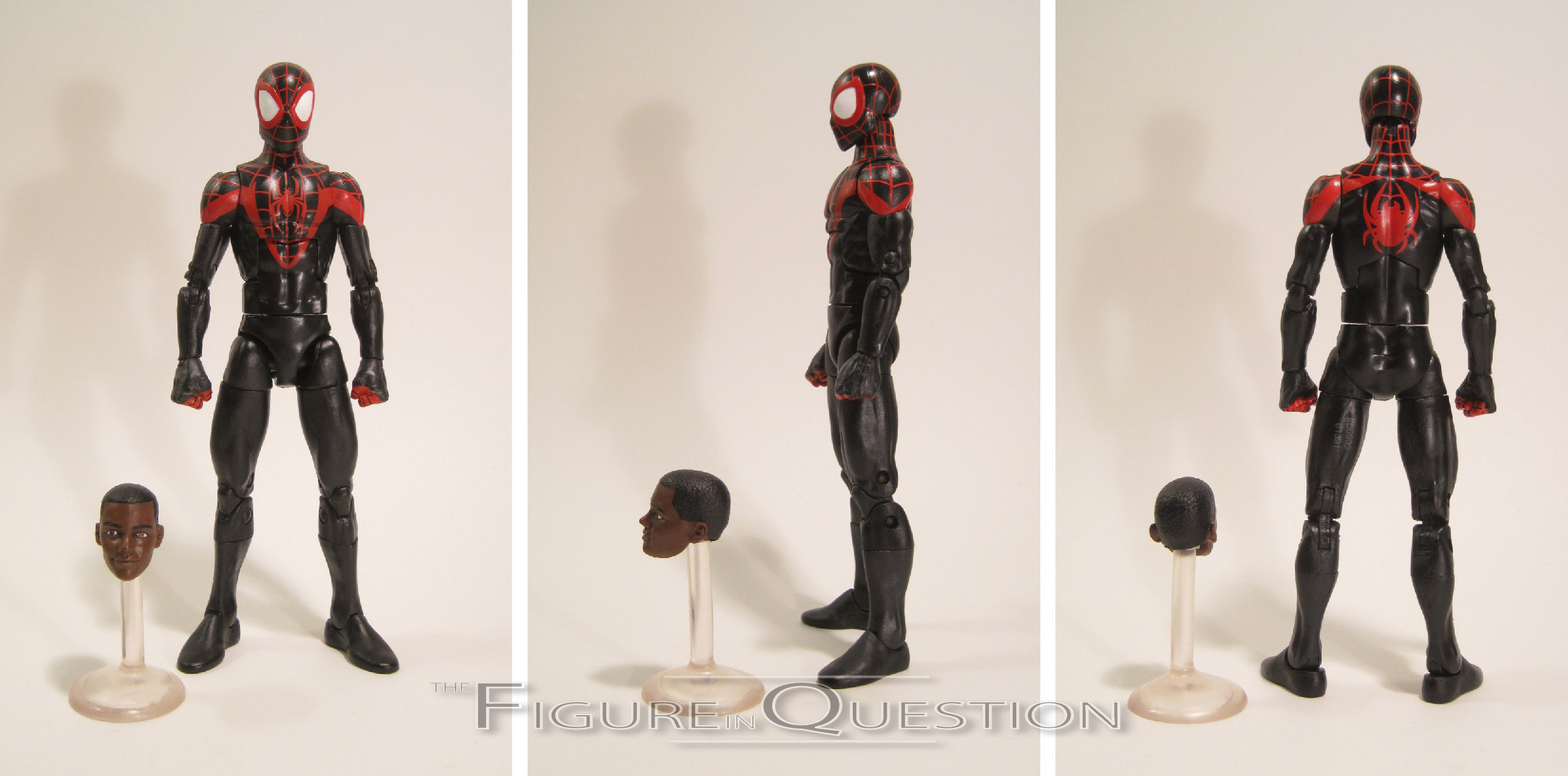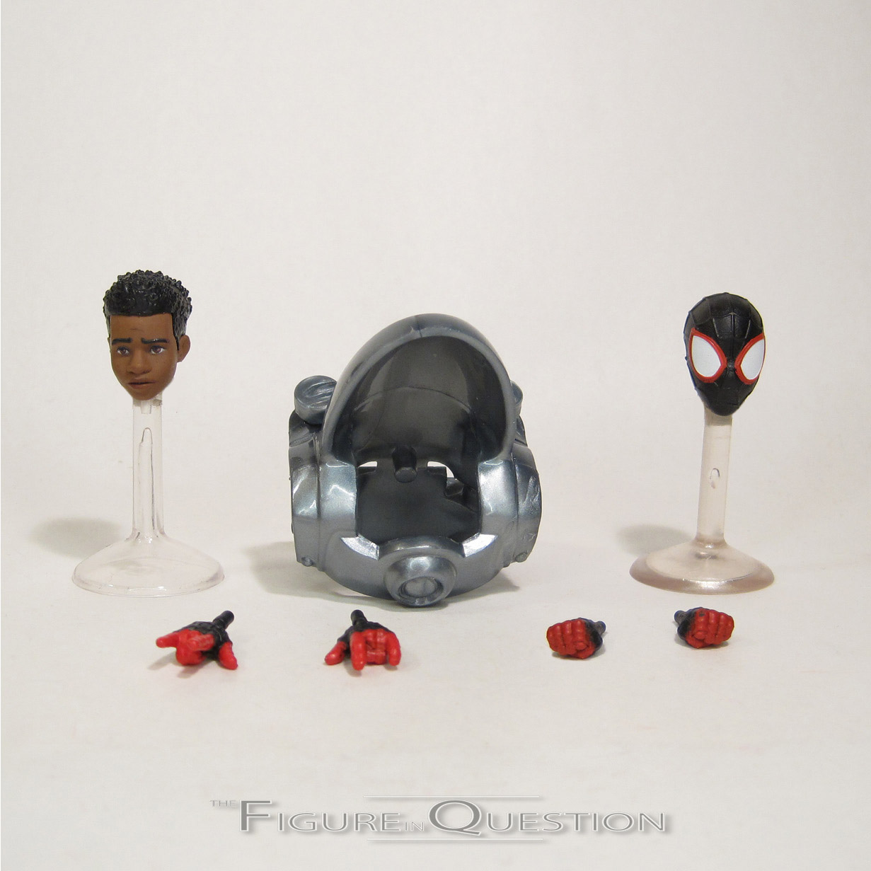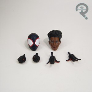 slick, but there’s also some subtle dark blue work. It’s easy to miss, but it adds a little extra pop to the figure’s visual. Miles is packed with an extra unmasked head and two sets of hands (thwipping and fists). The last unmasked head didn’t *quite* land the film design, especially the hair, but this one really gets it down. Also, they don’t have the weird ball joint for each head, so that’s a plus. Of course, it’s still a smaller socket size than the standard, so swapping isn’t going to really be a thing, but it’s progress. As with the last Miles, I do wish we’d gotten another set of hands with open gesture, but I’ll just have to continue to be disappointed with every Spider-Man that cuts those, I guess.