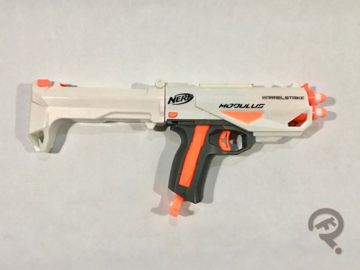 First things first, I have no idea why they went with “Mediator” for the name of a blaster. It doesn’t have quite the same sort of imposing punchy quality as something like the Rampage or Retaliator. Even in the context of a conflict, a mediator is supposed to be a neutral third party that gets two opposing sides to agree on something. I don’t know, just feels like a weird choice, but that’s what it’s called so I guess let’s just roll with it. The Mediator was released in 2018 as part of the Modulus line of products, Like I said, the Mediator operates much like other pump mag blasters but with 2 major differences. I would say they’re improvements, but I’m sure there are people who aren’t fans. Probably the same weirdos that thought The Last Jedi was the worst thing ever, but that’s neither here nor there. The shell of the Mediator is all new work apart from the standard Nerf barrel and stock attachment points. That actually brings us to the first big improvement, that being customizability. While you could expect to find a stock attachment and a rail on pretty much all other pump mag blasters, what you never found was a second rail (I’m counting the Raider/Rampage’s rails as one big one, fight me) or a barrel attachment lug, both of which the Mediator provides quite handily. The extra rail on the right